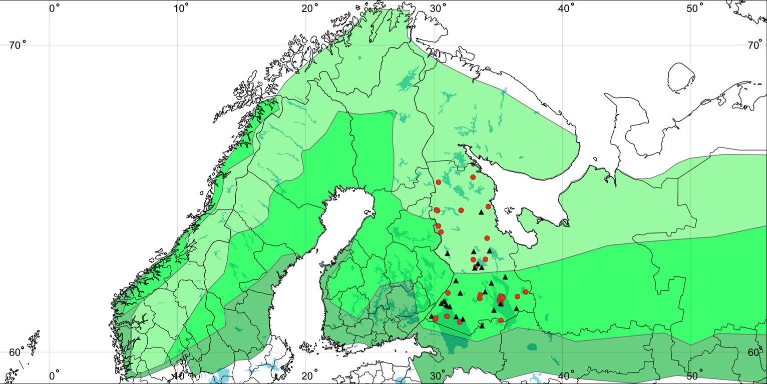 Figure 1. Boundaries of the northern, middle and southern taiga subzones in Fennoscandia and Karelia. Small mammal fleas collection sites in the 1950s are marked with triangles, in the 2000s with circles. The map was made in SimpleMappr (Shorthouse, 2010).