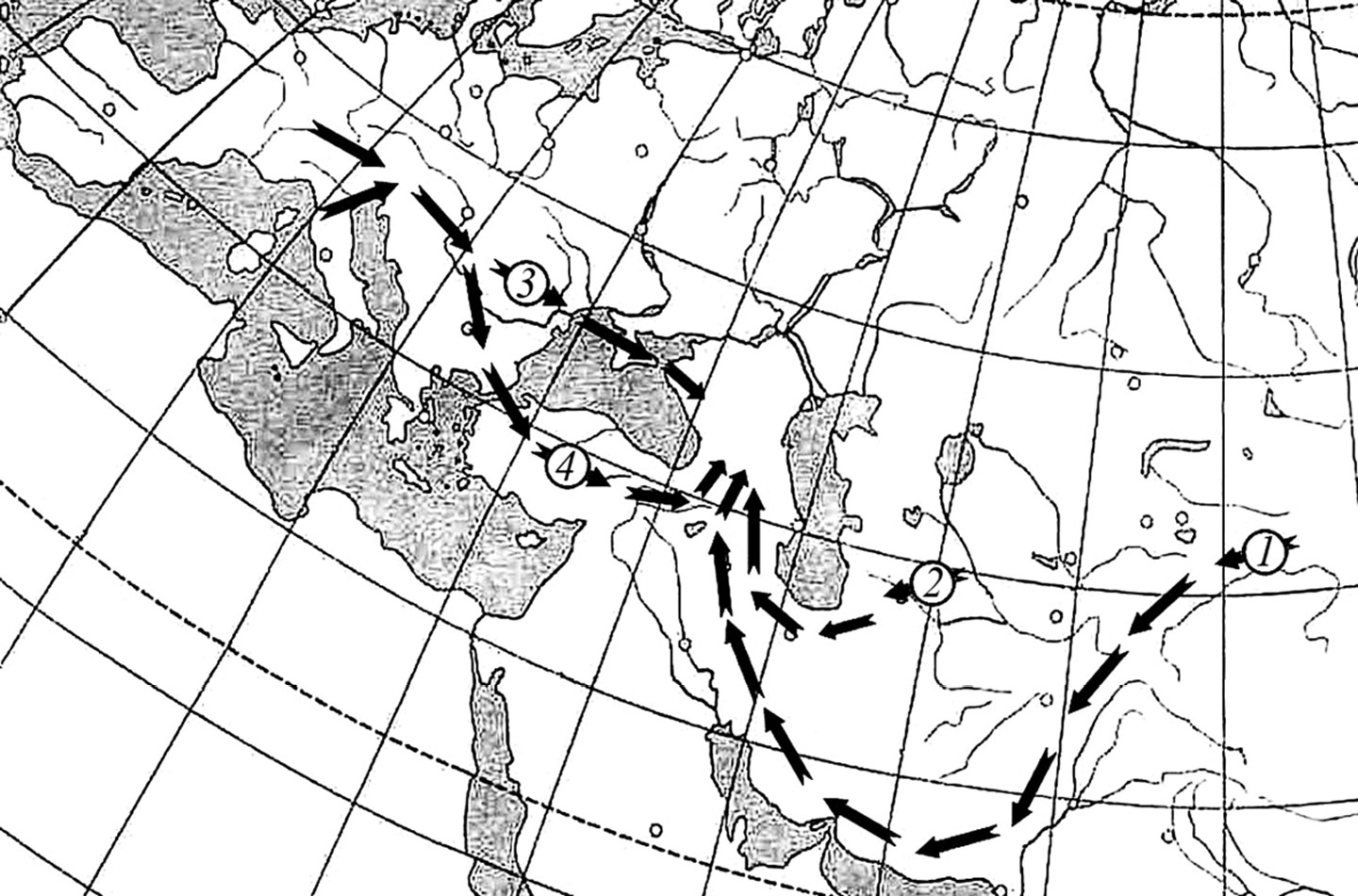 Рисунок 1. Пути миграций анцестральных видов эндемиков флоры Кавказа из видообразовательных центров Древнего Средиземья: 1 – из Гималаев, Белуджистана, Загроса в Переднюю Азию и на Малый Кавказ; 2 – из Копетдага через Эльбурс на Малый Кавказ; 3 – из Апеннин, Альп, Динарид, Карпат через Горный Крым на Большой Кавказ; 4 – из Альп через Балканиды и Эллиниды в Малую Азию и на Малый Кавказ (по: Иванов, 2022).