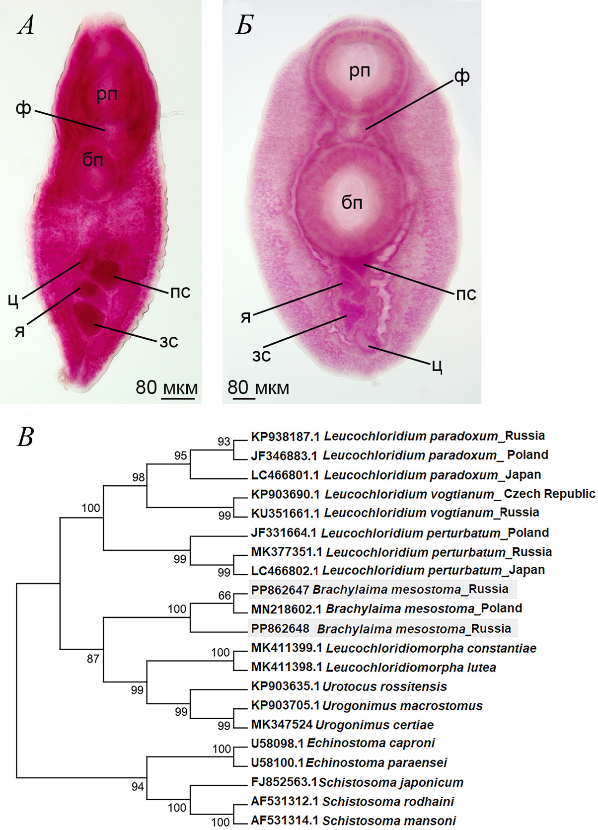 Figure 2. Metacercariae of Brachylaima mesostoma (A), Pseudoleucochloridium soricis (Б); B – Phylogenetic reconstruction performed by the maximum likelihood (ML) method based on the partial region of 5.8S–ITS2 rDNA (543 bp) using the Jukes–Cantor model. Number at the branch nodes percentage bootstrap support for 1000 replicates Numbers of used sequences from GenBank are shown. The sequences obtained in this study are highlighted. бп – ventral sucker, зс – posterior testis, к – intestine, пс – anterior testis, рп – oral sucker, ф – pharynx, ц – cirrus, я – ovary.