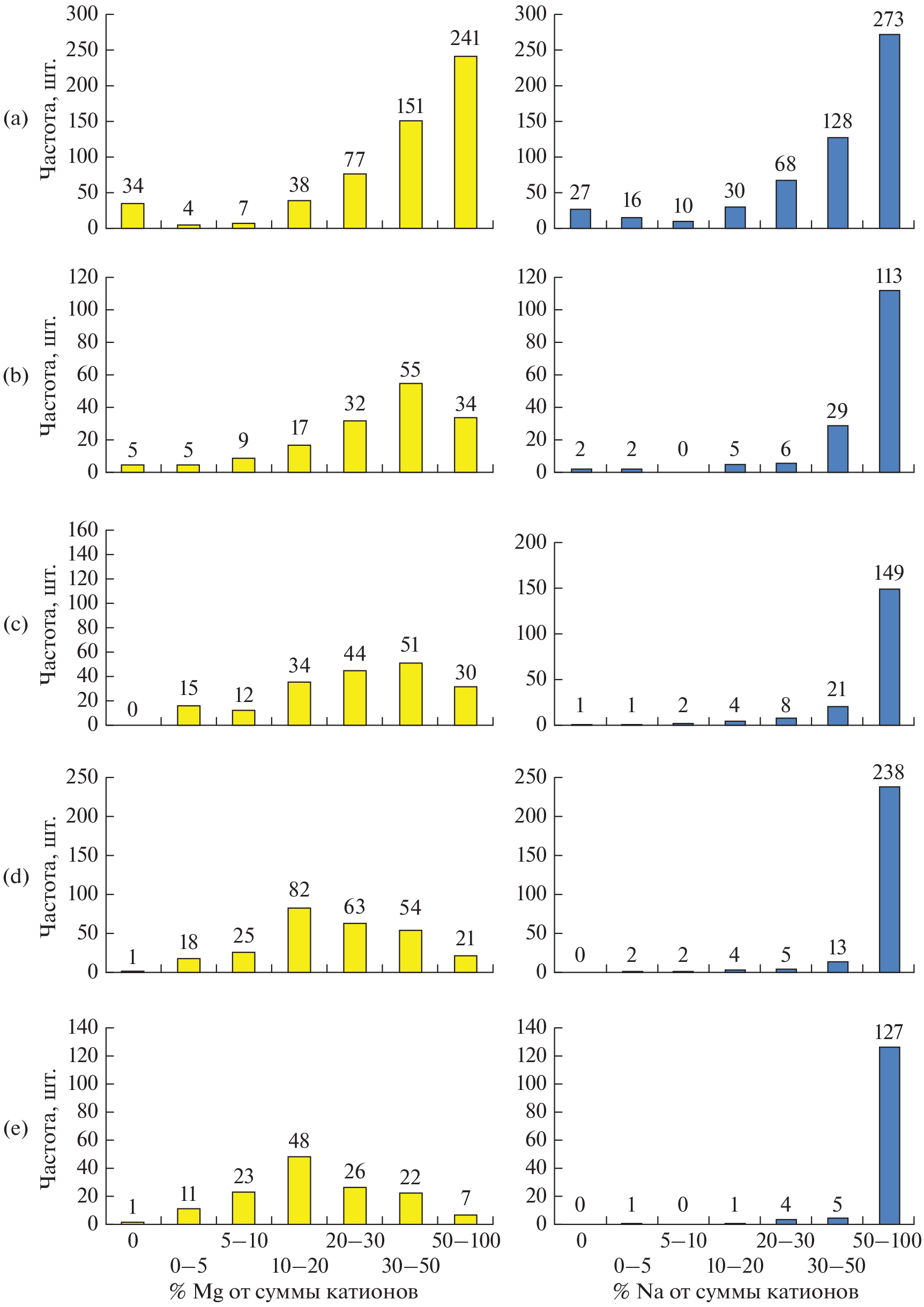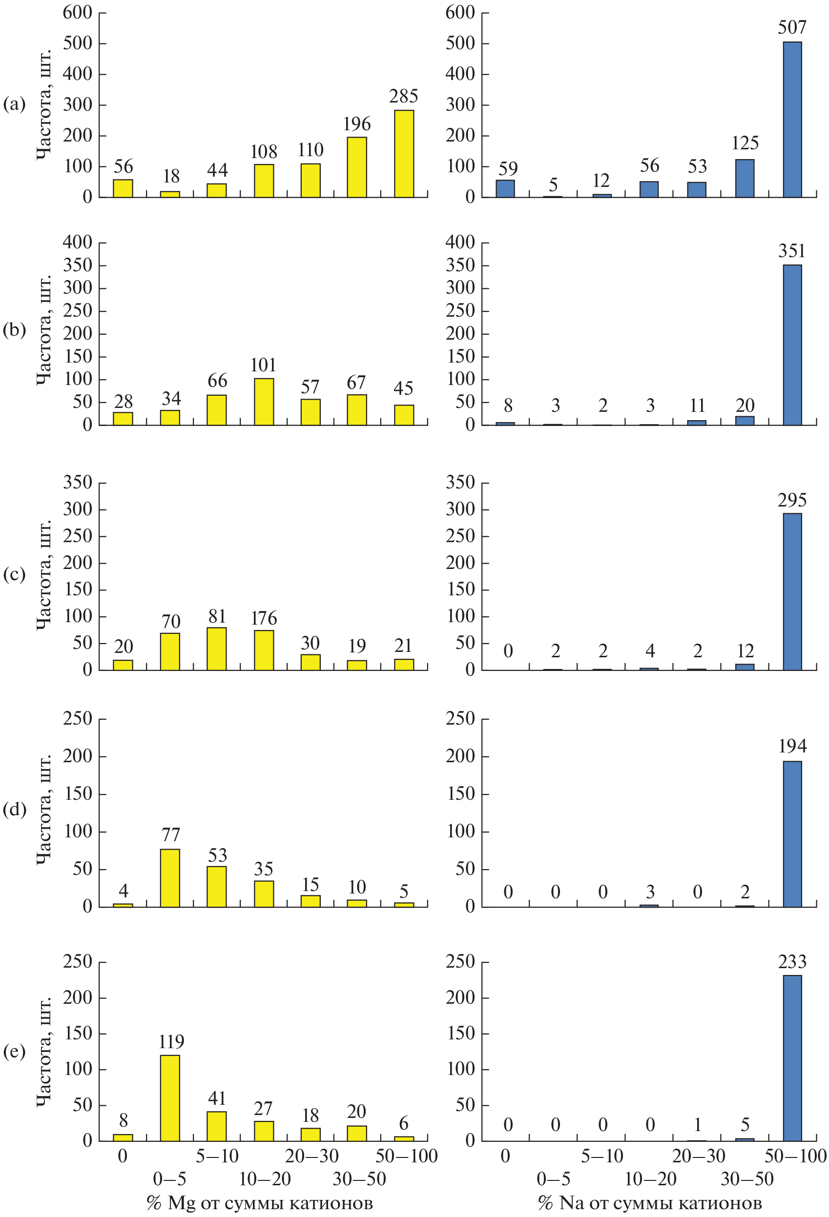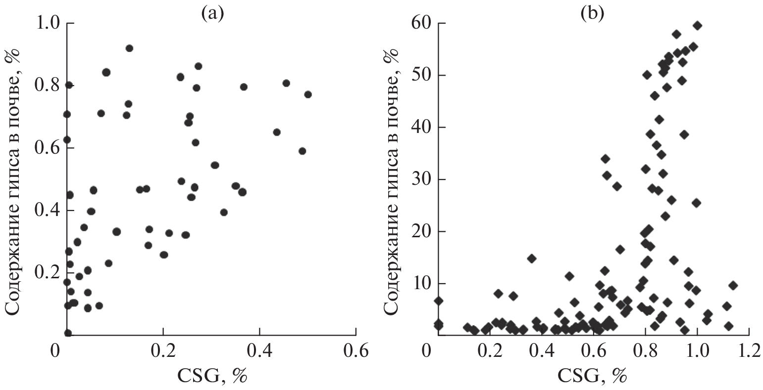 Statistical analysis of 3802 samples of saline soils from different regions of Russia made possible to substantiate observations of a higher proportion of magnesium in soils containing gypsum compared to saline soils without gypsum. Gypsum is not a toxic salt and its presence does not lead to an increase in salinity. The increase of the salinity degree is mainly associated with sodium and magnesium salts, with the proportion of sodium more often than the proportion of magnesium. The article statistically substantiates that in the studied saline soils that do not contain gypsum, among the cations in the water extract (1 : 5), sodium most often dominates at any degree of salinity. The appearance of gypsum in the soil profile is accompanied by a significant increase in the proportion of magnesium. With a low and medium degree of salinity in horizons containing more than 1% gypsum, according to the median, as well as the arithmetic mean, upper quartile and maximum, the proportion of magnesium from the sum of sodium and magnesium in the water extract (1 : 5) is often more than 50%. Even at a strong and very strong degree of salinity, the proportion of magnesium in gypsum-containing horizons is significant and amounts to 43 and 31%, respectively, on the median, which is 5.8–6.7 times higher than the proportion of magnesium in gypsum-free horizons of the same degree of salinity.