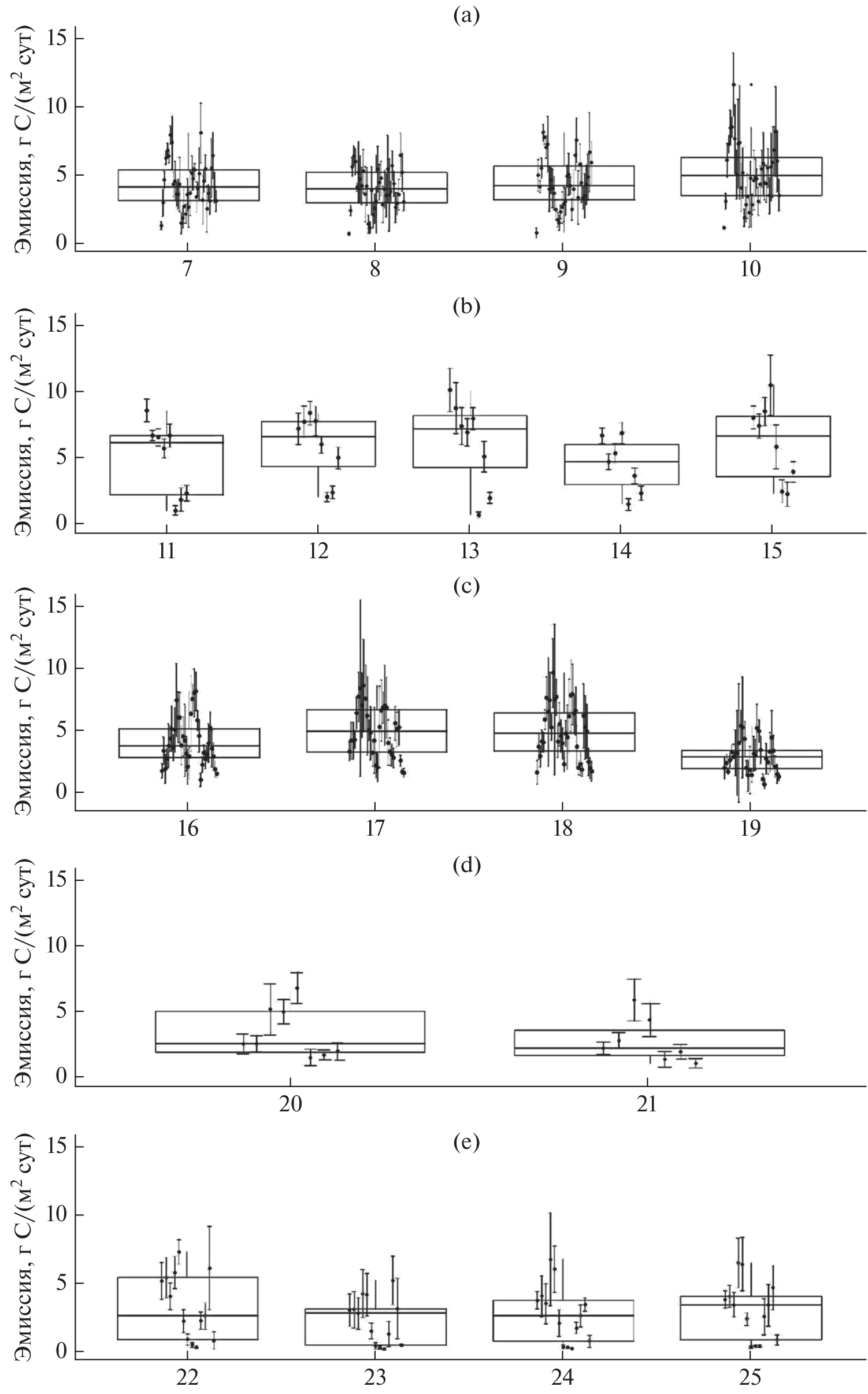The Far East has been and remains the part of Russia least studied with respect to carbon fluxes. We reviewed the results of in situ measurements of carbon emission from the surface of forest soils obtained at 26 points in the southern part of the Far East on the territory of 4 constituent entities of Russia. The measurements were taken in different forest formations (larch, cedar, oak, ash, and elm forests), including forests in the permafrost zone. Information on seasonal and daily dynamics of emission is presented. Equations are presented for 14 sites to estimate the emission from the air temperature of the nearest weather station. Annual fluxes vary by measurement points in the range of 5.5–10.1 t C/ha, with a maximum value in the old-growth cedar-fir forest of southern Primorye. The contribution of the summer season to the annual flux is 49–81%. In the western part of the territory under consideration (Buryatia), carbon emission from the soil surface strongly depends on soil temperature and moisture. In over moistened soils, the emission is significantly affected by the groundwater level (R2 = 0.42). In Primorye forests, the soil moisture factor ceases to have a significant effect on the emission. Discussion of the results in the context of modern studies in other regions shows comparability of the survey estimates and possibility of their use for analysis of global trends and regularities. Translated with www.DeepL.com/Translator (free version).