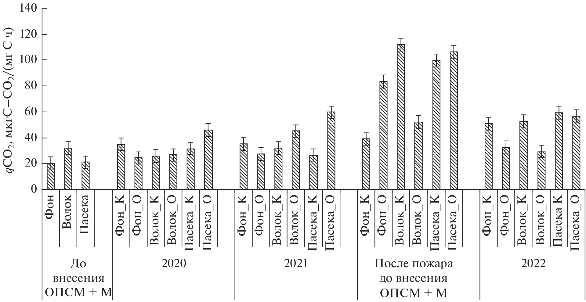 The biological activity of dark gray soil was studied in a 100-year-old pine forb-green-moss forest of the Pogorelsky pine forest of the Krasnoyarsk forest-steppe. In 2017, selective cuttings were carried out in the pine forest, and in May 2022 there was a strong fire. To improve reforestation and increase the biological productivity of the soil, bio-fertilizer based on sawdust-soil substrate with the addition of urea and mycoproduct (SSSU + M) was applied to cut and burned areas. On the experimental plots (Paseka, Volok, Fon), an annual count of self-seeding of pine was carried out. Bioindication of the soil condition was assessed based on the total number and ratio of ecological-trophic groups of microorganisms, enzyme activity, microbial biomass content, intensity of basal respiration and specific respiration of microbial biomass. The application of biofertilizer to the cut areas alkalized the soil by 0.2–0.4 units, retained moisture, increased the content of nitrogen (by 5–14%) and microbial biomass (by 1.2–1.6 times), compared with the control options. The impact of biofertilizers on the germination and growth of self-seeding of pine was noted in the second year after application – in the experimental plots of self-seeding it was 4–6 times greater than in the control ones. The entry of burnt plant residues, coals and ash into the soil in the first week after the fire led to an increase in some microbiological indicators, the activity of urease and invertase, and the activation of carbotrophic microorganisms. However, by the end of the growing season, a decrease in microbiological activity was noted, which indicated a post-pyrogenic depression of microbocenoses. The introduction of biofertilizer on the burnt surface of the plots leveled the effect of pyrogenic effects and stimulated the formation of shoots of scots pine, the number of which was significantly higher than in the control plots. It was found that the universal bioindicators that adequately reflect the state of the soil after all anthropogenic impacts were microbial biomass, specific microbial respiration, enzymatic activity and the total number of microorganisms. A specific bioindication of the soil condition after the fire was an increase in the proportion of bacteria Serratia plymuthica, Bacillus mycoides and fungi of the genera Trichoderma, Penicillium and Mortierela.