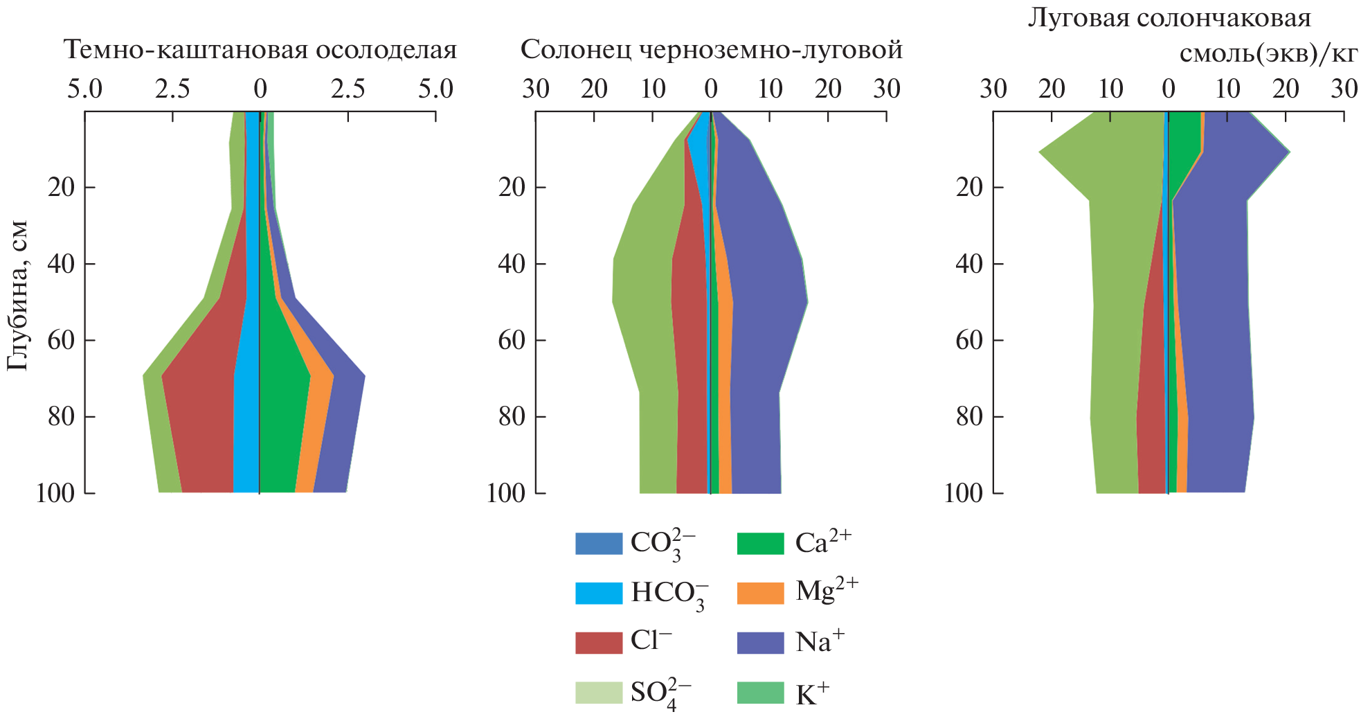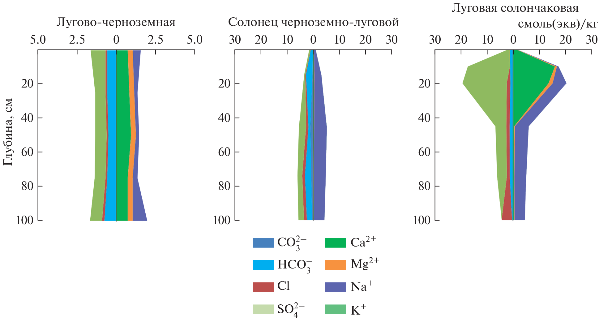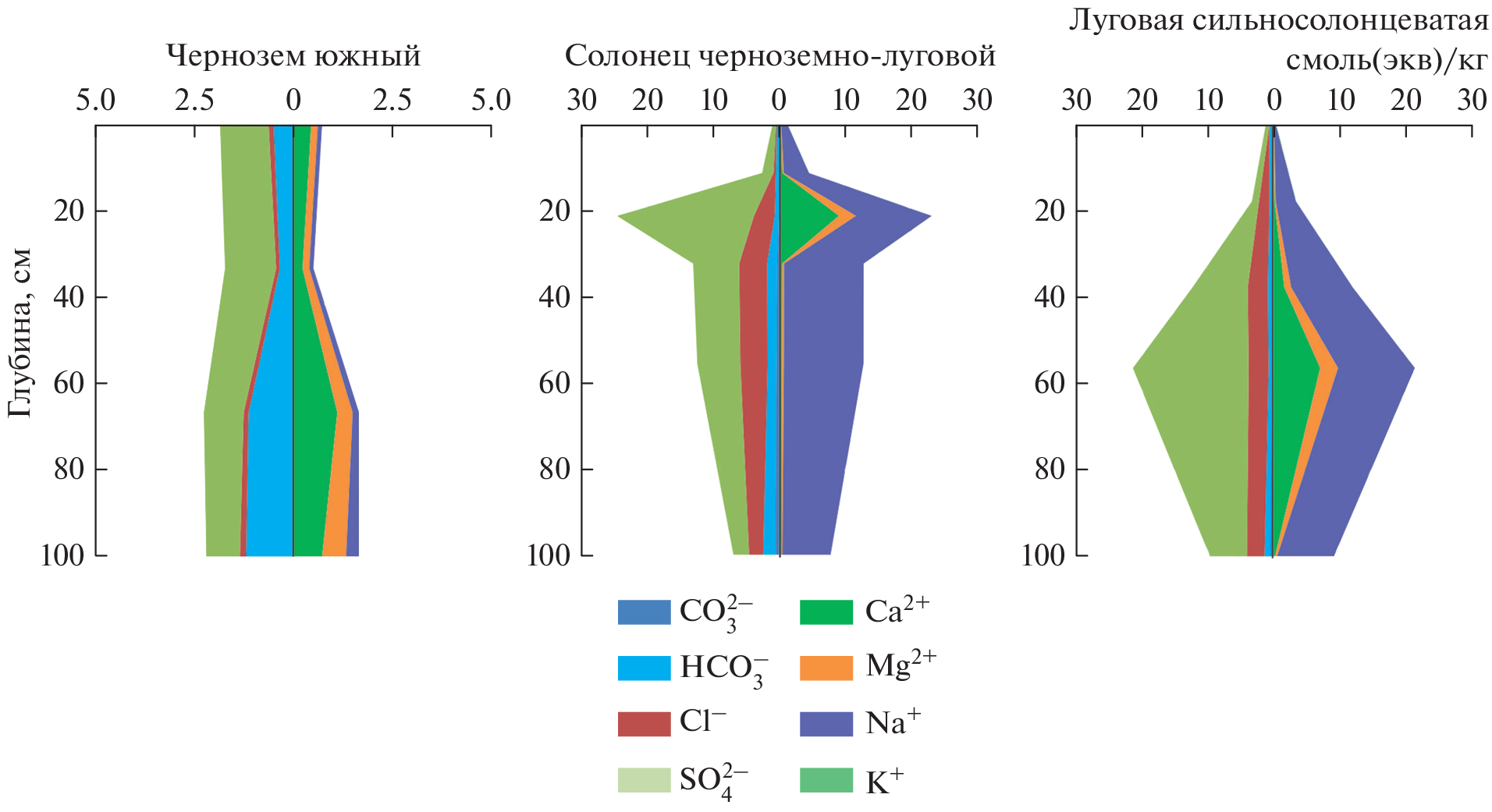 The surface of the Kulunda Plain is dissected by a system of ancient wide valleys, former runoff hollows, which have a very small slope (less than 1°). Rivers flow along these weakly expressed valleys, redistributing readily soluble salts throughout the territory. The regime of these rivers is characterized by a sharp and high flood wave and low (up to complete drying) runoff in the summer. The purpose of this work is to study the ion-salt system of soils of ancient runoff troughs of the Kulunda Plain, groundwater and river waters in order to identify modern processes of soil salinization. During floods, river water feeds close-lying groundwater, influencing its chemical composition. Studies of three key sites in the valleys of the Bagan (Novosibirsk region), Burla and Kulunda (Altai Territory) rivers took place in 2021–2022. Ground waters of varying degrees of mineralization (from 3.4 to 63.0 g/l) and lie close to the surface (2–5 m), which causes a wide distribution of saline hydromorphic soils in the study area. Differences in the salt state of soils in different valleys, groundwater and river waters are discussed. The degree of salinization of soils depended on their granulometric composition. The high content of physical clay contributed to the rise of salts with groundwater and their accumulation in the soil profile. A large amount of exchangeable sodium in the soil absorbing complex of the studied soils (more than 3–5 cm (eq)/kg), the predominance of easily soluble sodium salts in the soil solution with its low mineralization, as well as the alkaline reaction of the soil medium indicates the manifestation of the process of soil salinization.
