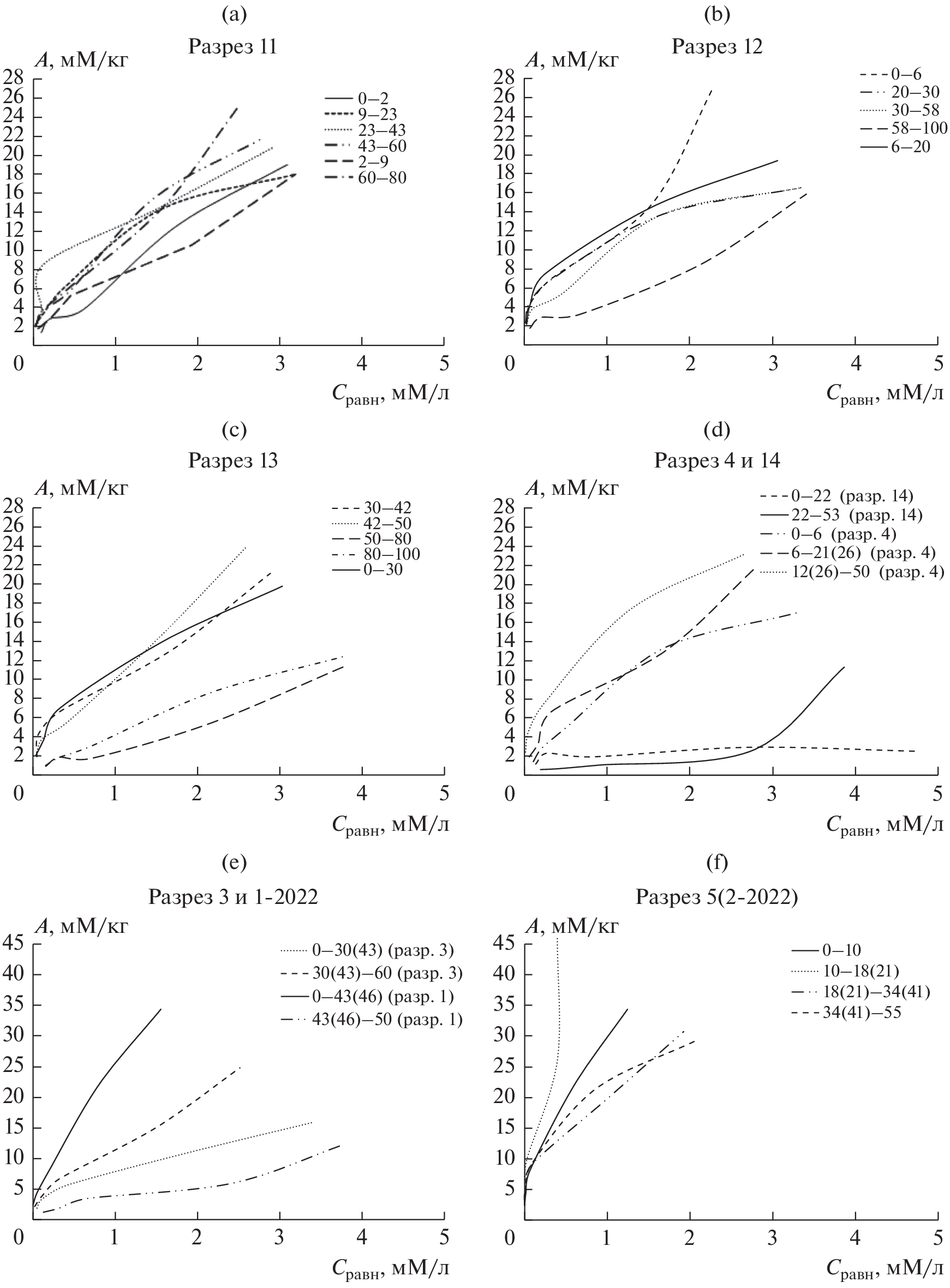 The sorption of phosphorus by salt marshes of the dry-steppe zone of the Republic of Buryatia from an aqueous solution of KN2PO4 in the concentration range from 0.25 to 5.0 mM/L (mmol/L) was studied under static conditions. The interaction time is 24 hours with a soil: solution ratio of 1 : 10. The amount of sorbed phosphorus was calculated from the difference in its content in the initial solutions and in the filtrates of soil suspensions. Based on experimental data, phosphorus adsorption isotherms were constructed by soil and sorption parameters were calculated using the Langmuir and Freundlich equations. Typical and quasi-clay Solonchaks have relatively high sorption properties with respect to phosphorus. The value of the maximum adsorption capacity (Amax) in the humus horizons of these soils varied in the range of 23.04–42.74 mM P/kg, in the underlying horizons 16.26–30.39 mM P/kg. In general, all soils, with the exception of the sorov Solonchaks, had an Amax value in the range of 17.70–42.74 mM P/kg. A low sorption value of phosphorus was found in the Solonchaks of sorovy. The Langmuir adsorption constant (KL) varied in the range of 0.3–14.0 l/mmol. Solonchaks dark and typical most strongly bind phosphorus. The Freundlich coefficient (KF) in the studied soils varied in the humus horizon from 5.34 to 63.43 mM P/kg, in mineral from 1.74 to 22.68 mM P/kg. The distribution coefficient (Kd) ranged from 1.95–145.04 l/kg with high values for quasi-clay Solonchaks and low for sorov Solonchaks. The correlation between Kd and Amax was estimated as average (r = 0.51), Kd and KL – high (r = 0.84, p ≤ 0.05). The studied soils according to the values of SPR (the amount of phosphorus that must be sorbed by the soil to maintain a concentration of P = 0.2 mg/kg (0.0065 mM/l) in soil solution) from (0.0723 to 3.4836 mM/kg) refer to weakly absorbing phosphorus. According to the ability to sorb phosphorus, soils form the following decreasing series: quasi-glay solonchaks > typical solonchaks > dark solonchaks > glay solonchaks >alluvial light humus saline > sorov solonchaks.