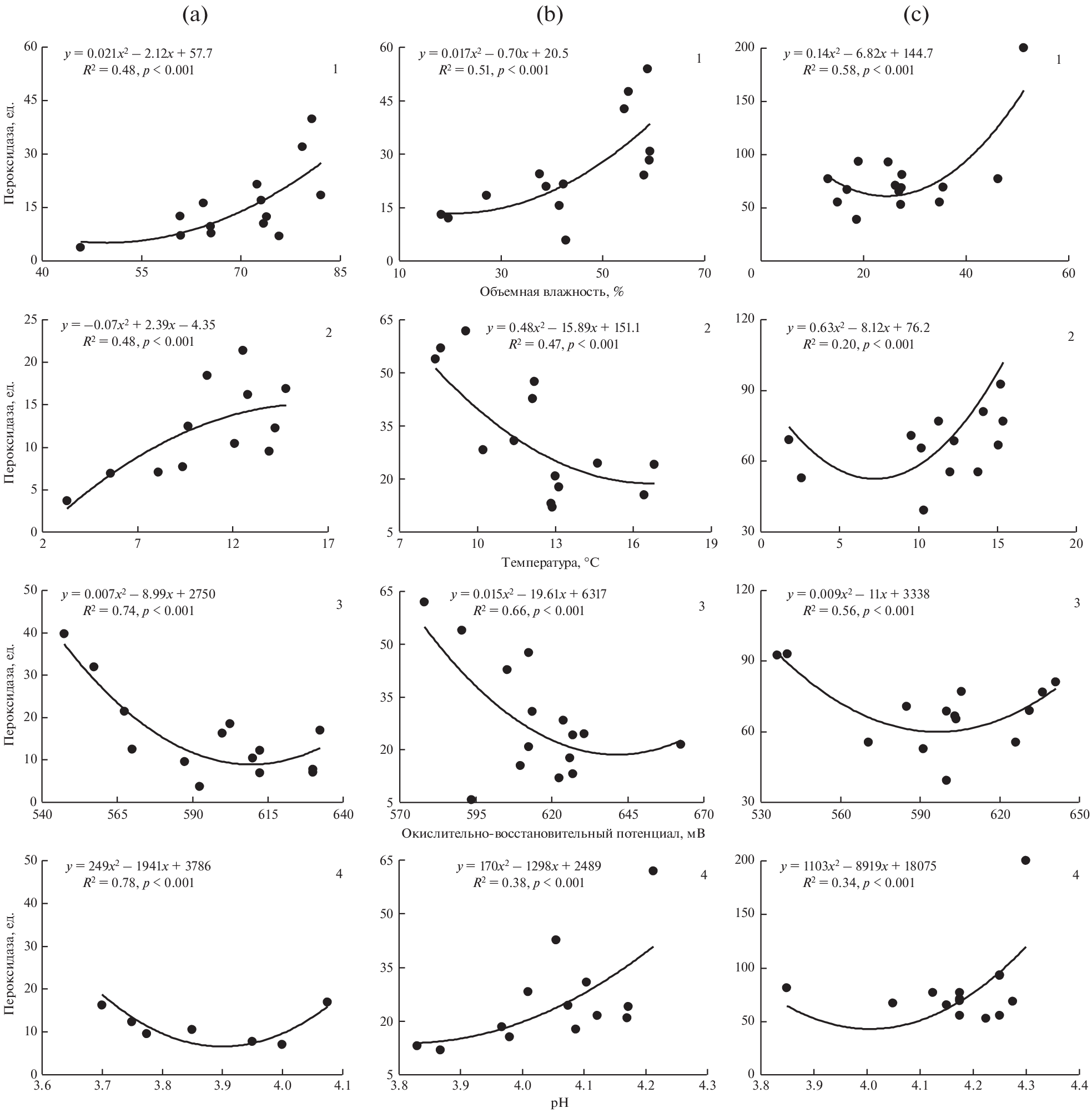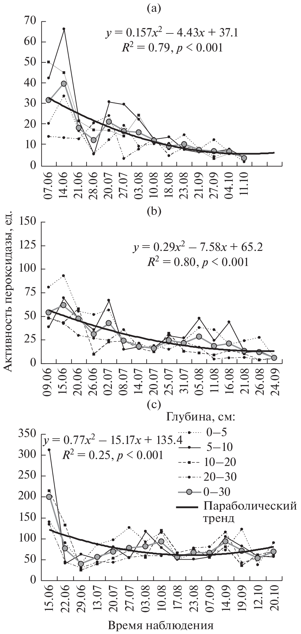 We studied a mesotrophic swamp drained 25 years ago, in the northern part of the Ob and Tom rivers (geographical coordinates 56°23′710″ N, 84°34′043″ E). In forest peat soils (0–30 cm), the weighted average of peroxidase activity for the season (base level) was in the mode of weak hydro reclamation 14.4, moderate – 21.9, intensive 70 units (ml I/g of abs. dry sample in 2 min). Second-order parabola is a most adequate function of the main trend of the development of seasonal fluctuations in peroxidase activity. Numerical values and signs of the parabolic trend parameters show that from June to October, the average peroxidase activity decreased weekly by 4.4, 7.6 and 15.2 units with weekly average acceleration by 0.31, 0.59 and 1.54 units in the mode of weak, moderate and intensive drainage, respectively. The seasonal wave of peroxidase activity relative to the baseline level is characterized by a June increase in growth rates, the maximum in the 0–10 cm layer. In July, there is a decrease in the growth rate according to the depth of reclamation: in the mode of weak and moderate drainage the process already covers the entire soil profile in August, in conditions of intensive drainage – in October. The enzyme activity is significantly positively related with soil bulk moisture and pH, negatively – with redox potential and multidirectionally – with soil temperature. Environmental conditions act as duplicate parameters when assessing their contribution to the seasonal dynamics of peroxidase, creating the effect of interchangeability of environmental gradients. Canonical determination indices approximate the cumulative impact of the discussed set by 52–74%, depending on the depth of reclamation. Canonical weights show that the main factor regulating the seasonal activity of peroxidase is the hydrothermal regime. According to canonical correlations, in conditions of weak drainage, to a greater extent under the influence of temperature, intensive – humidity, moderate drainage – humidity and temperature. The differentiated contribution of peroxidase activity in the formation of the humus state of peat soils of different degrees of drainage was revealed.