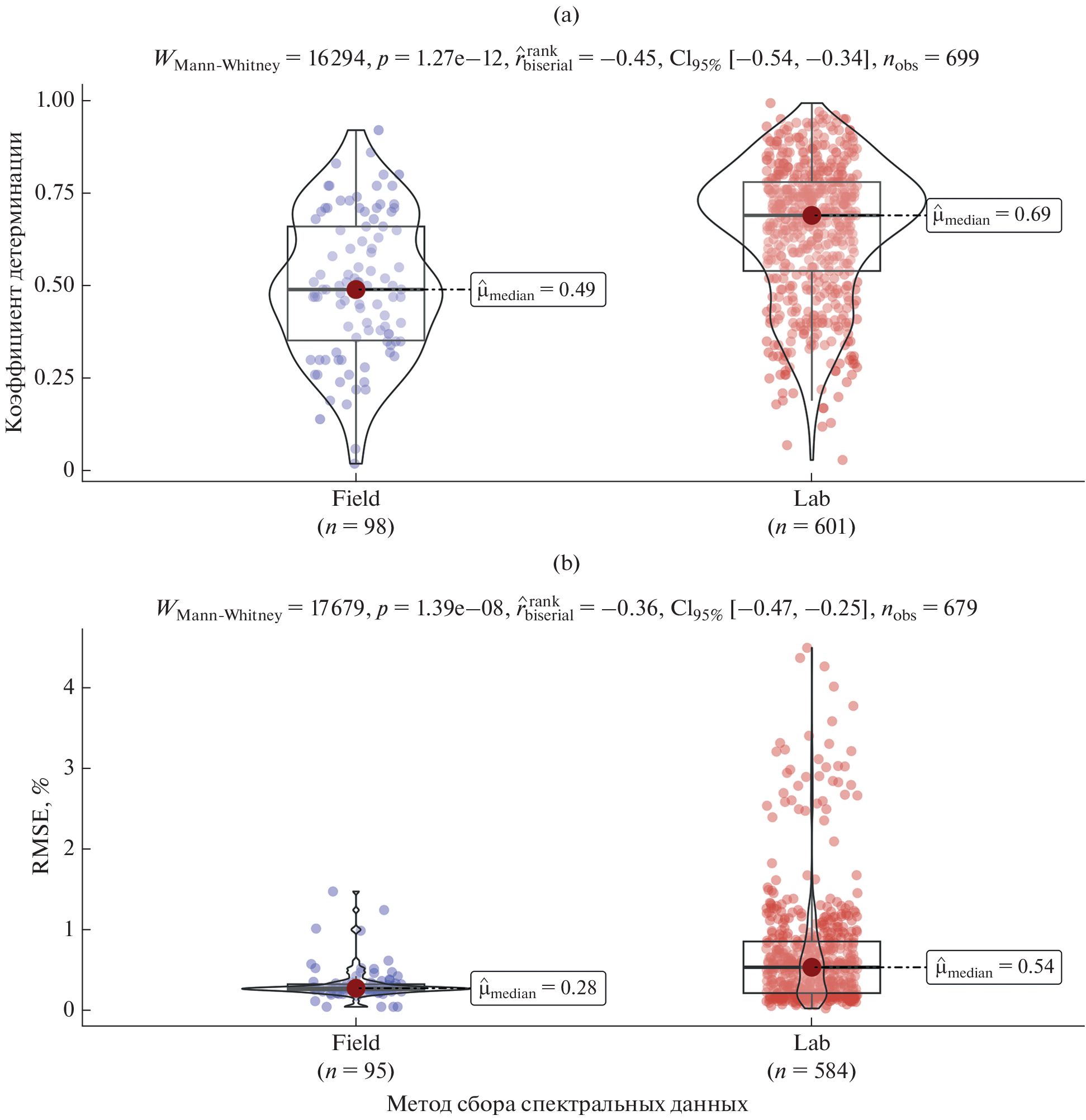 In this study, a systematic review and meta-analysis of scientific researches devoted to the assessment of the soil organic carbon content using Vis-NIR spectroscopy approaches was carried out. The meta-analysis included 134 studies published between 1986 and 2022 with a total sample of 709 values of quantitative metrics. The articles were searched in databases of scientific periodicals: RSCI, Science Direct, Scopus, Google Scholar by the key words: “Vis-NIR spectroscopy AND soil organic carbon”. In the process of meta-analysis, using the nonparametric one-sided Kraskel-Wallis variance analysis in conjunction with the nonparametric pairwise method, the presence of a statistically significant difference between the median values of the accepted quantitative metrics of the predictive power of the models (coefficient of determination (R2cv/val), root mean square error (RMSE) and the ratio of performance to deviation (RPD) comparisons. As a result, the best efficiency (from the point of view of comparing these metrics) was revealed for the method of preprocessing spectral curves, for various multidimensional data analysis approaches used, and the results of assessing the organic carbon content of soils were compared between spectroscopy in the laboratory and directly in the field.
