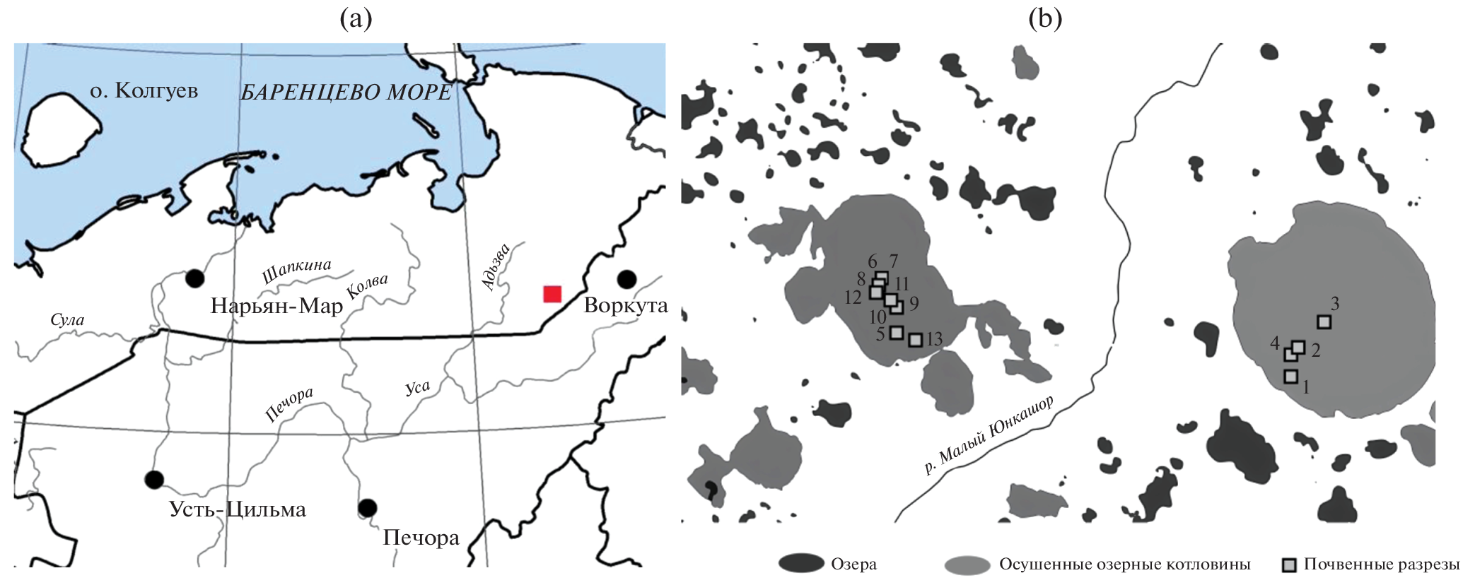 The features of the structure, properties, and temperature regimes of soils functioning in two different drained lake basins of the Bolshezemelskaya tundra are characterized. The basins differ significantly in the features of landscape development, the composition of bottom (soil-forming) sediments, and the patterns of the soil and vegetation cover. In a naturally drained basin composed of mineral (sandy and clayey) bottom sediments, soils belonging to the departments Gley, and Poorly developed are formed, which are typical for the watershed landscapes of the region. Soils function as ecosystem-modified permafrost-affected profiles, partially protected from thaw. The soil profile is acidic, not saturated with bases, with moderate carbon content in the mineral horizons. In the artificially drained basin, covered with a layer of silted peat, predominantly peaty permafrost-affected soils were formed, including peat soils of tundra meadows, which are unique for the landscapes of the Bolshezemelskaya tundra. Peaty soils of the basin appear to be as ecosystem-protected, i.e. protected from thawing, and they are characterized by high ash content and slightly acidic reaction. A significant differentiation of the studied soil parameters are determined by different basins, which are different according to the composition of parent sediments, the specifics of landscape development, and manifestations of present-day cryogenic processes.