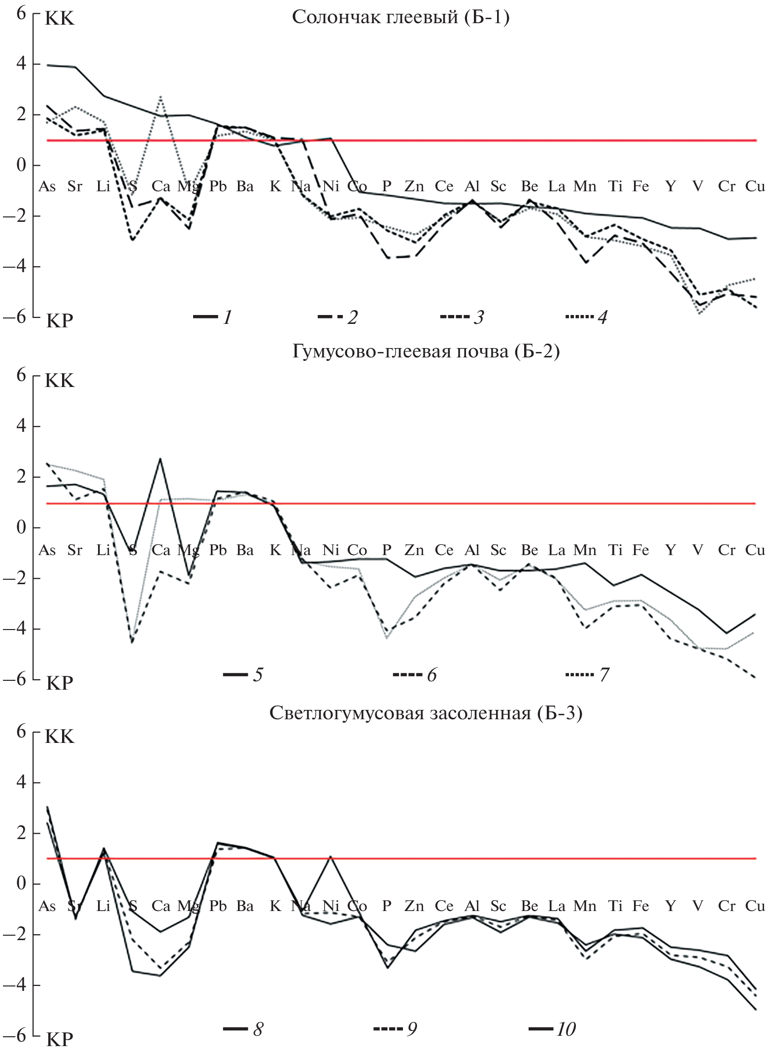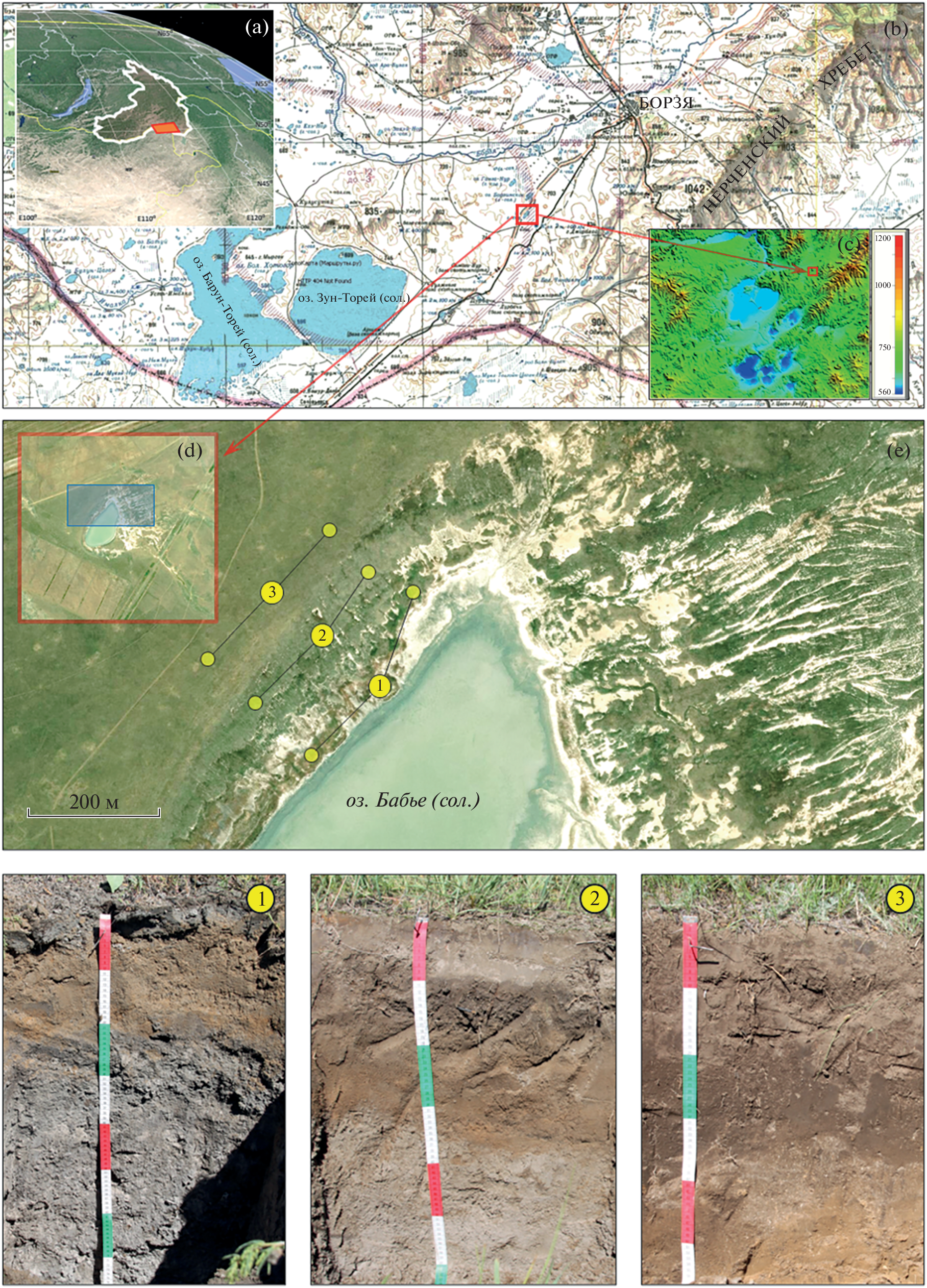 Data on saline soils of drainless lakeside depressions, which are formed in areas of extra continental climate with a cyclic 25–30-year change in the level of lakes within the arid and humid climatic phases, were obtained first. Different types of soils are shown to be formed on the landscapes adjacent to highly mineralized chloride lakes of southeastern Trans-Baikal Region: on superaqueous–subaqueous positions– gleyic solonchaks (Gleyic Solonchak (Loamic, Chloridic)); on superaqueous – humus–gley saline soils (Calcaric Mollic Gleysol (Arenic, Endosalic, Sodic)); on eluvial-superaqueous – light-humus saline soils (Fluvic Kastanozem (Epiarenic, Amphiloamic, Sodic)). Salinity degree of the soils under the study is different. Salinity chemistry is sodium taking into account cations. Anion content in solonchaks and upper horizon of humus-gley soil is mostly chloride. Soda-chloride and chloride-soda anion composition prevail in other soils. Gleyic solonchaks have strongly alkaline pH values, high content of carbonates, and a sharp dominance of Na+ among exchangeable cations. Many chemical elements are concentrated in the solonchakous horizon (Sr, S, Li, Mg, Ca); a high content of As is a regional feature. The humus-gley saline soil has the same properties as the light-humus saline soil in terms of physico-chemical parameters, and in terms of elemental composition and texture as solonchaks. This is due to it functions periodically in a semihydromorphic or hydromorphic regimes when changing the arid and humid phases. The high level of groundwater contributes to the enrichment of soils with the elements typomorphic for lake waters. The paleohydromorphic stage of development has been established to be recorded in lower layers of light-humus saline soil in the form of a high content of easily soluble salts and carbonates. The geochemical specialization of soil-forming rocks is associated with the significant accumulation of As, as well as concentration of Li, Ba, and Pb. It was also revealed that low Ca/Sr ratio is their geochemical feature. The use of cluster analysis of indicators of soils under the study revealed that both dynamic and stable soil parameters are reflected in humus-gley soil and it is recommended for monitoring of the dynamics of endorheic lakeside ecosystems in Central Asia with cyclic climatic phases.