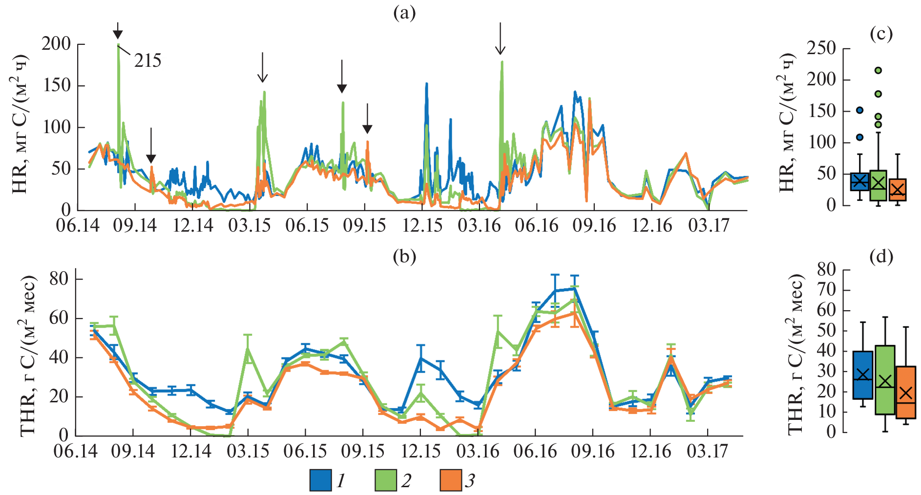 - Jarvis P., Rey A., Petsikos C., Wingate L., Rayment M., Pereira J., Banza J., David J., Miglietta F., Borghetti M., Manca G., Valentini R. Drying and wetting of Mediterranean soils stimulates decomposition and carbon dioxide emission: the “Birch effect” // Tree Physiol. Oxford Academic, 2007. V. 27. P. 929–940. https://doi.org/10.1093/treephys/27.7.929
