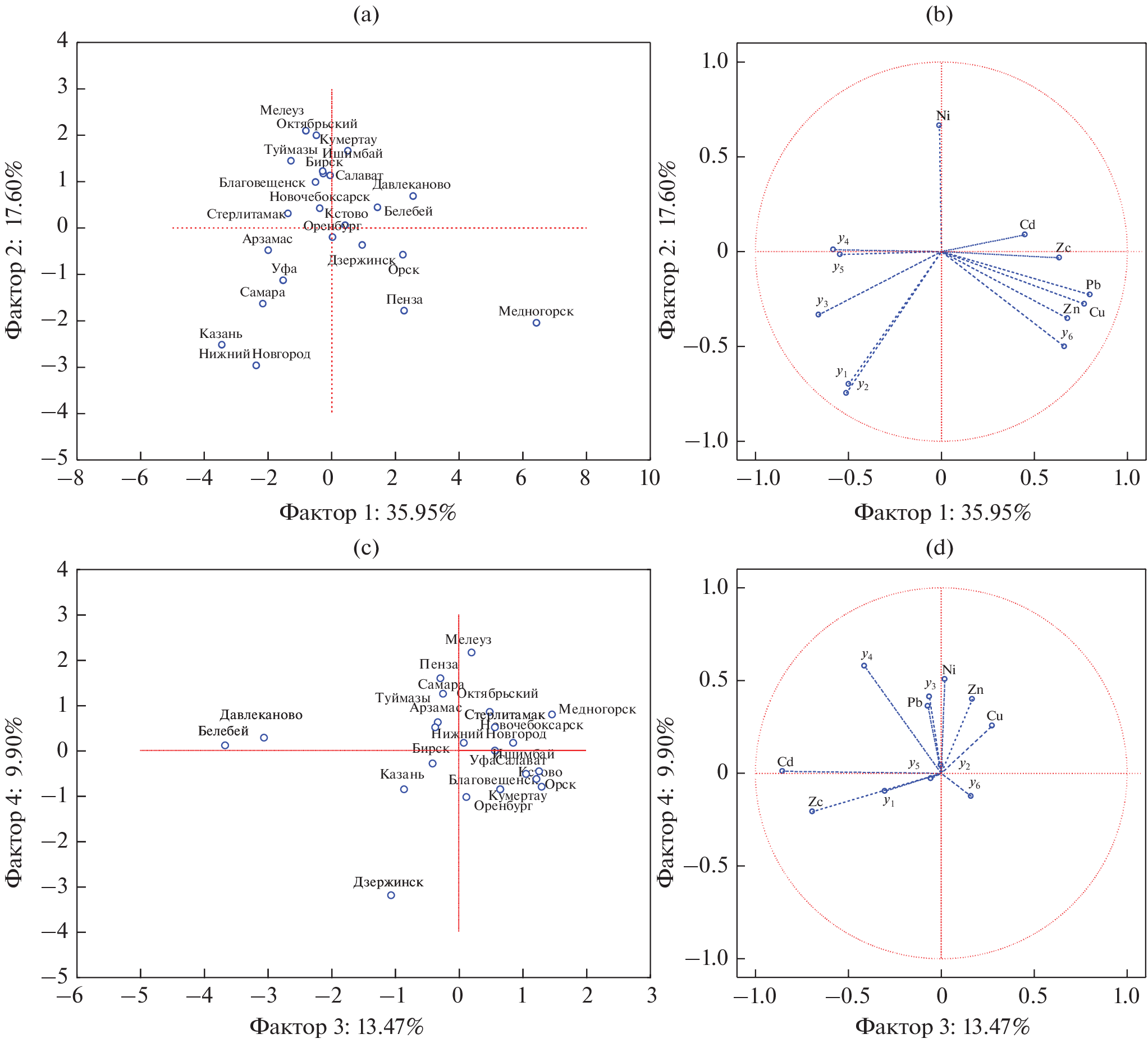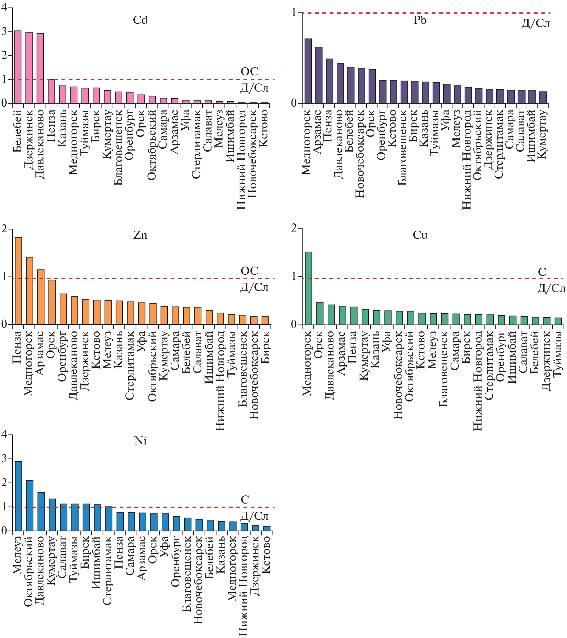 Based on a conjugated analysis of the official data of Roshydromet on the content of priority heavy metals (Cd, Pb, Zn, Cu, Ni) in the soils of 23 cities of the Volga Federal District, as well as Rosstat data on the socio-economic indicators of these settlements, the ecological and geochemical characteristics of urbanozems (Urbic Technosols) and with the help of multivariate statistical analyzes (cluster and factorial), possible relationships between soil pollution parameters and urban features of cities were revealed. For the soils of most cities in the region with average socioeconomic indicators, admissible levels of accumulation of Cd, Pb, Zn, and Cu have been established, which, in terms of concentrations, are close to the average abundance of urban soils in Russia. In small and medium-sized cities of the Republic of Bashkortostan, exceedances of APC Ni in soils are recorded, which reflects the presence of a regional geochemical anomaly of natural and anthropogenic nature in the eastern part of the Volga Federal District, but no correlations between nickel pollution and socio-economic indicators of settlements are revealed. The moderately hazardous level of complex pollution in urbanozems with dominant accumulation of Cd and significantly lower concentration ratios of other heavy metals (Belebey, Davlekanovo, Dzerzhinsk) shows no correlation with the demographic indicators of settlements. The more complex profile of soil pollution (Cd–Zn in Penza or Cu–Cd–Zn in Mednogorsk) shows lower values of the total fertility rate and higher values of the mortality rate (compared with the average regional indicators). In general, using the example of the cities of the Volga Federal District, it is shown that the gradients of increasing concentrations in soils of Cd, Pb, Zn, Cu and the total pollution index Zc are codirectional with an increase in the general mortality rate of the population.