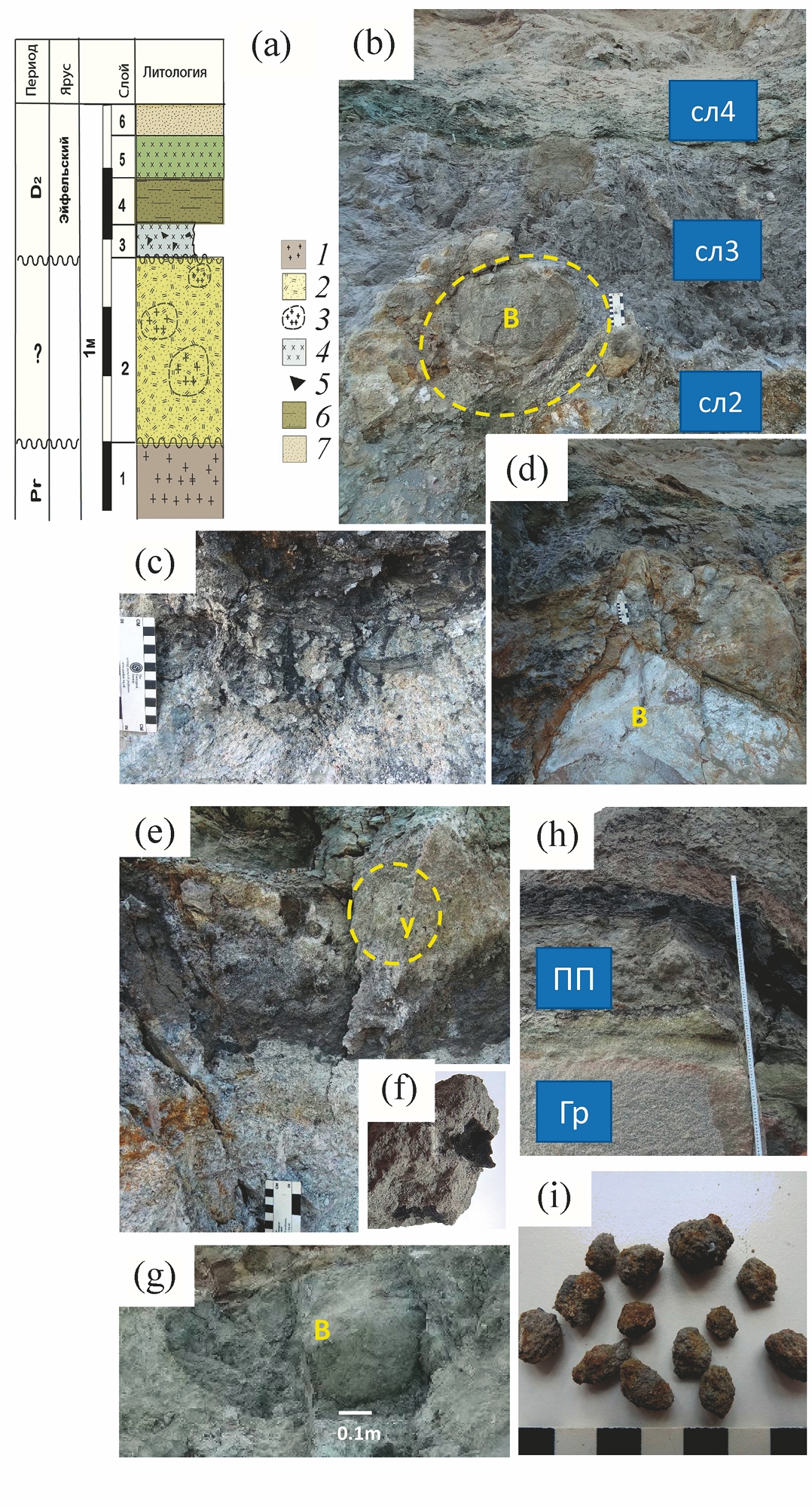 Рис. 1. Изученные профили палеопочвы: a – фрагмент стратиграфической колонки отложений девона, вскрываемых в Павловском карьере; b – профиль палеопочвы PV22-2; c – фрагмент языковатой подошвы профиля PV22-2; d – профиль палеопочвы PV22-2, включение гранитного валуна (в) с развитой ожелезненной коркой на его поверхности; e – профиль палеопочвы PV20-9, на фото видна языковатая подошва профиля палеопочвы и включения углей (у); f – фрагмент (e), включение угля, диаметр 5 мм; g – профиль палеопочвы PV20-9, включение гранитного валуна (в) с развитой областью выветривания; h – профиль палеопочвы PV21-4; i – железисто-гипсовые нодули в профиле палеопочвы PV21-4 (слой 3/1). Легенда к колонке: 1 – протерозойский гранитный фундамент, 2 – кора выветривания фундамента, 3 – включения гранитных валунов, 4 – палеопочва на риолитовом туфе, 5 – включения угля, 6 – морские глины, 7 – вулканогенно-осадочная порода.