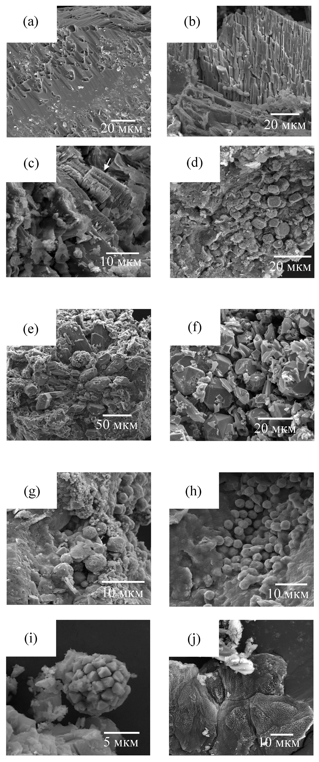Рис. 3. Минеральные преобразования в профиле палеопочвы по данным РЭМ (сводные данные): a – растворение зерна кварца с формированием так называемых “ямок травления” на его поверхности; b – выветривание зерна К-полевого шпата по плоскостям спайности; c – поликристалл аутигенного, так называемого “вермикулярного” каолинита (показано стрелкой); d – кристаллы Fe – оксида со следами растворения; e – гипсовая “роза”; f – пиритизация углистого вещества; g – разные морфологические разности пирита – монокристаллы, фромбоидальный пирит, микрокристаллы, а также глинистые пленки каолинитового состава; h – микрокристаллы пирита, утопающие в каолинитовой пленке; i – фромбоидальный пирит; j – Tetraplanisporites.