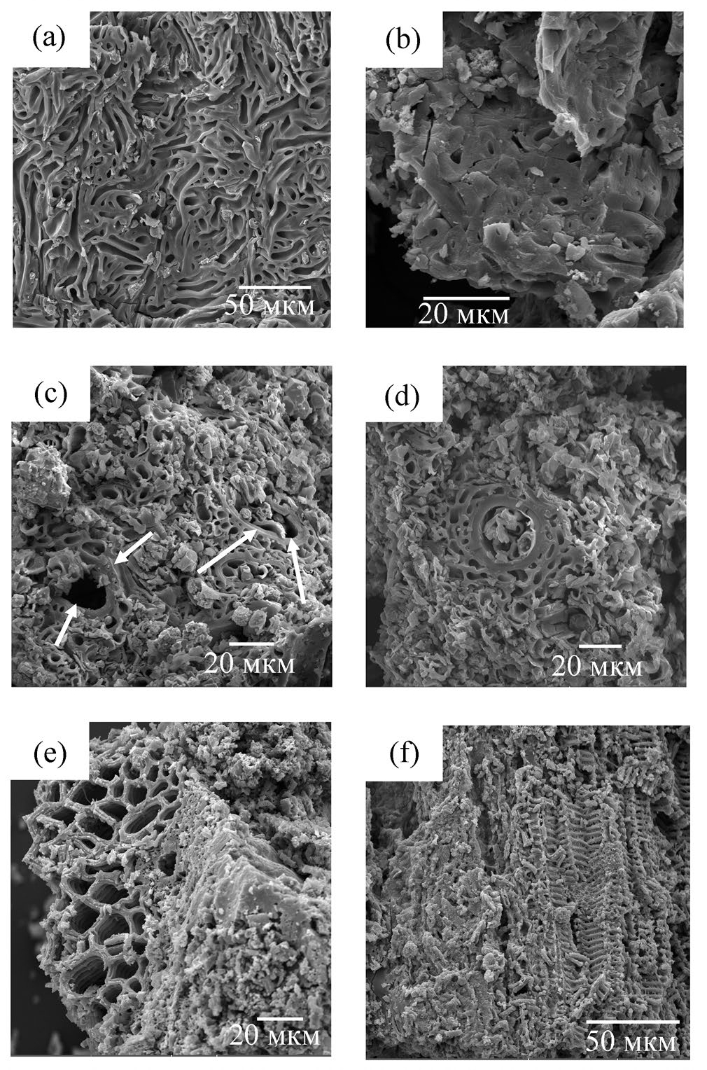 Рис. 5. Микростроение углистых включений в риолитовом туфе по данным РЭМ: a и b – строение тканей вымершего организма Nematophytales; c – строение тканей вымершего организма Prototaxites, стрелками показаны “скелетные” трубки; d – морфология “скелетной” трубки Prototaxites; e–f – строение тканей вымершего сосудистого растения класса зостерофилловые (Zosterophyllopsida) из слоя 3/2 профиля PV22-2.