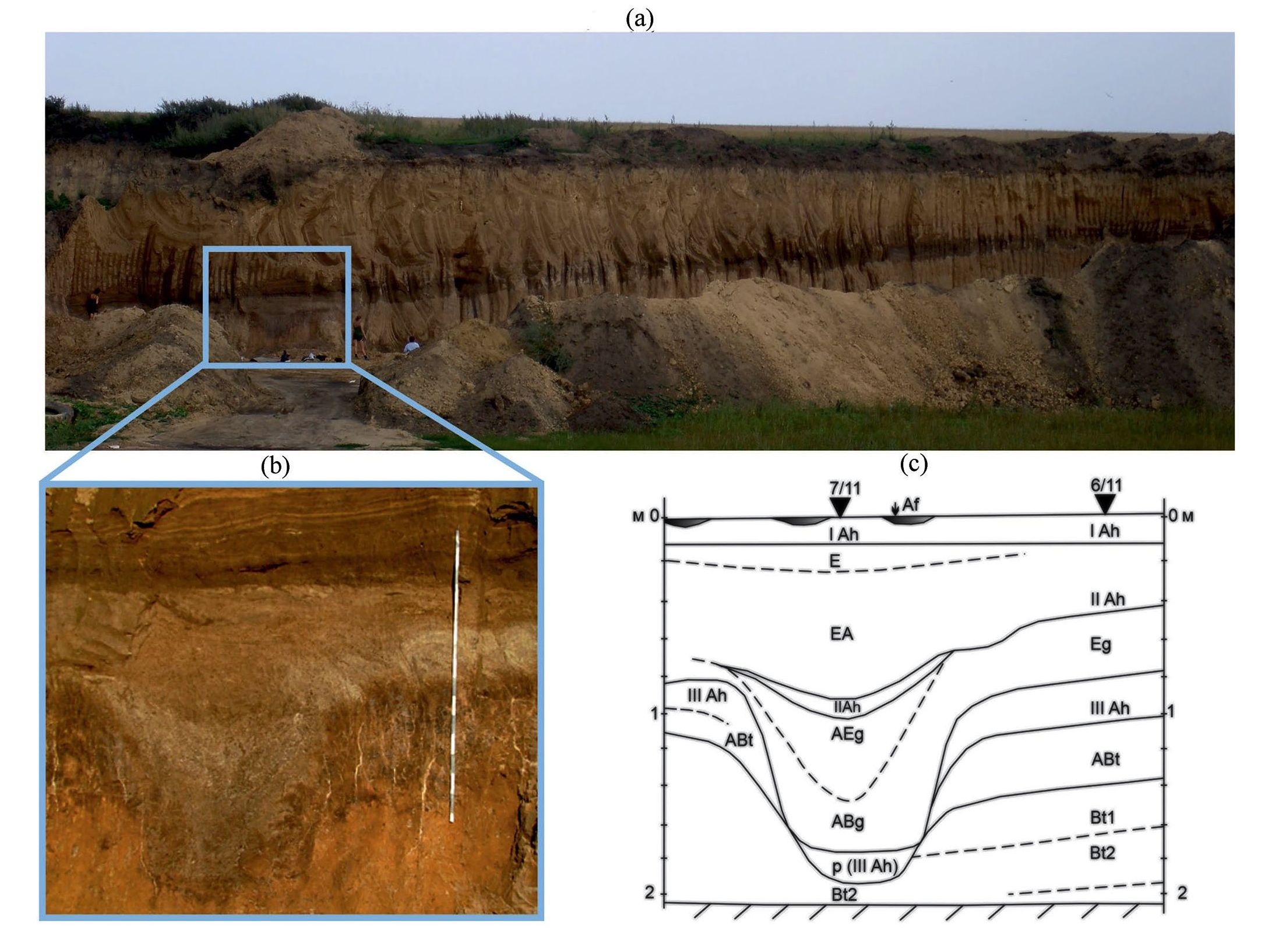 Рис. 2. Палеосклон московско-микулинской ложбины северной экспозиции, осложненный погребенным оврагом: а – общий вид палеосклона, b – овраг, c – строение рышковского педолитокомплекса в изученных разрезах 6/11 (склон) и 7/11 (днище оврага).