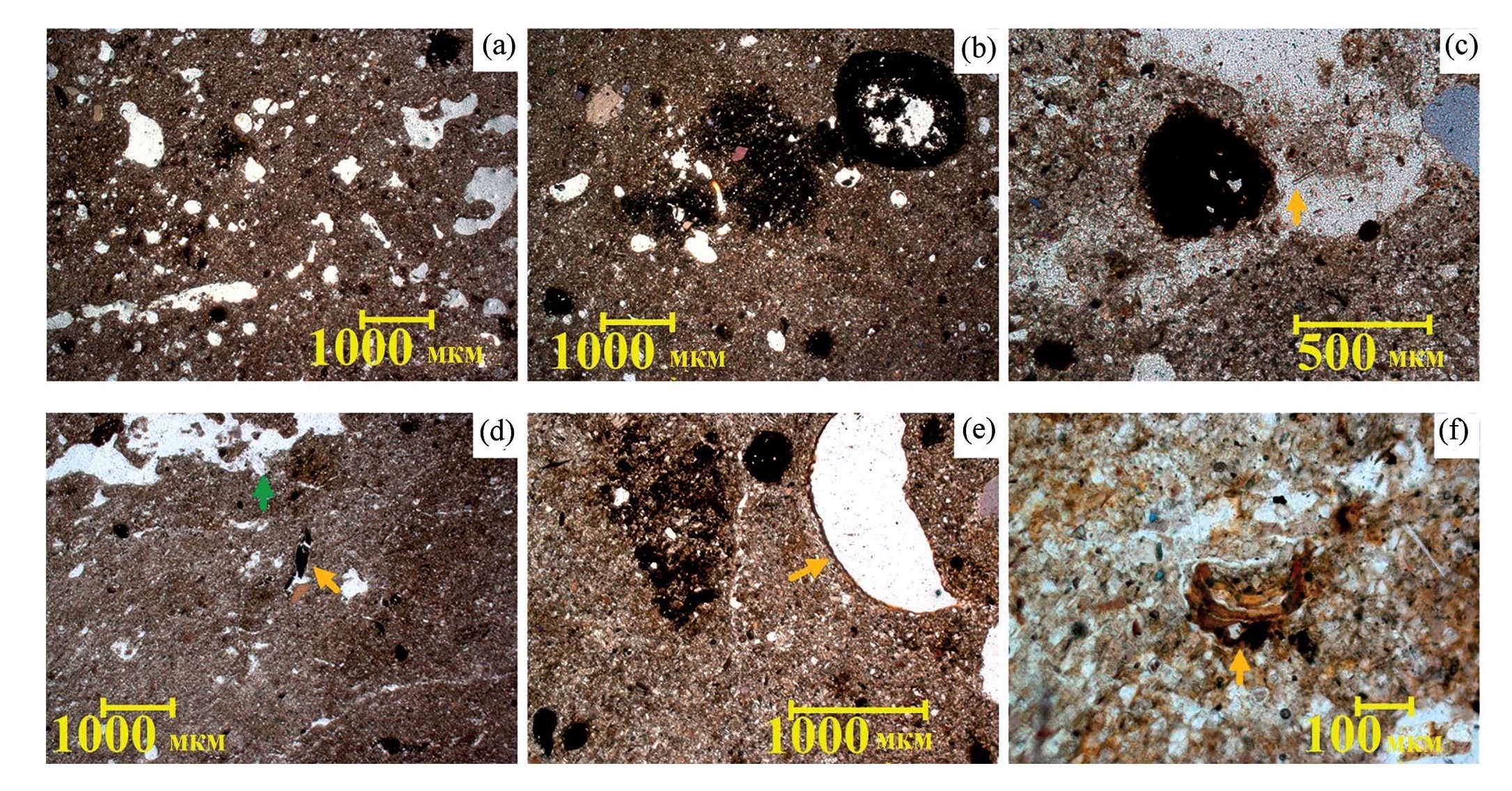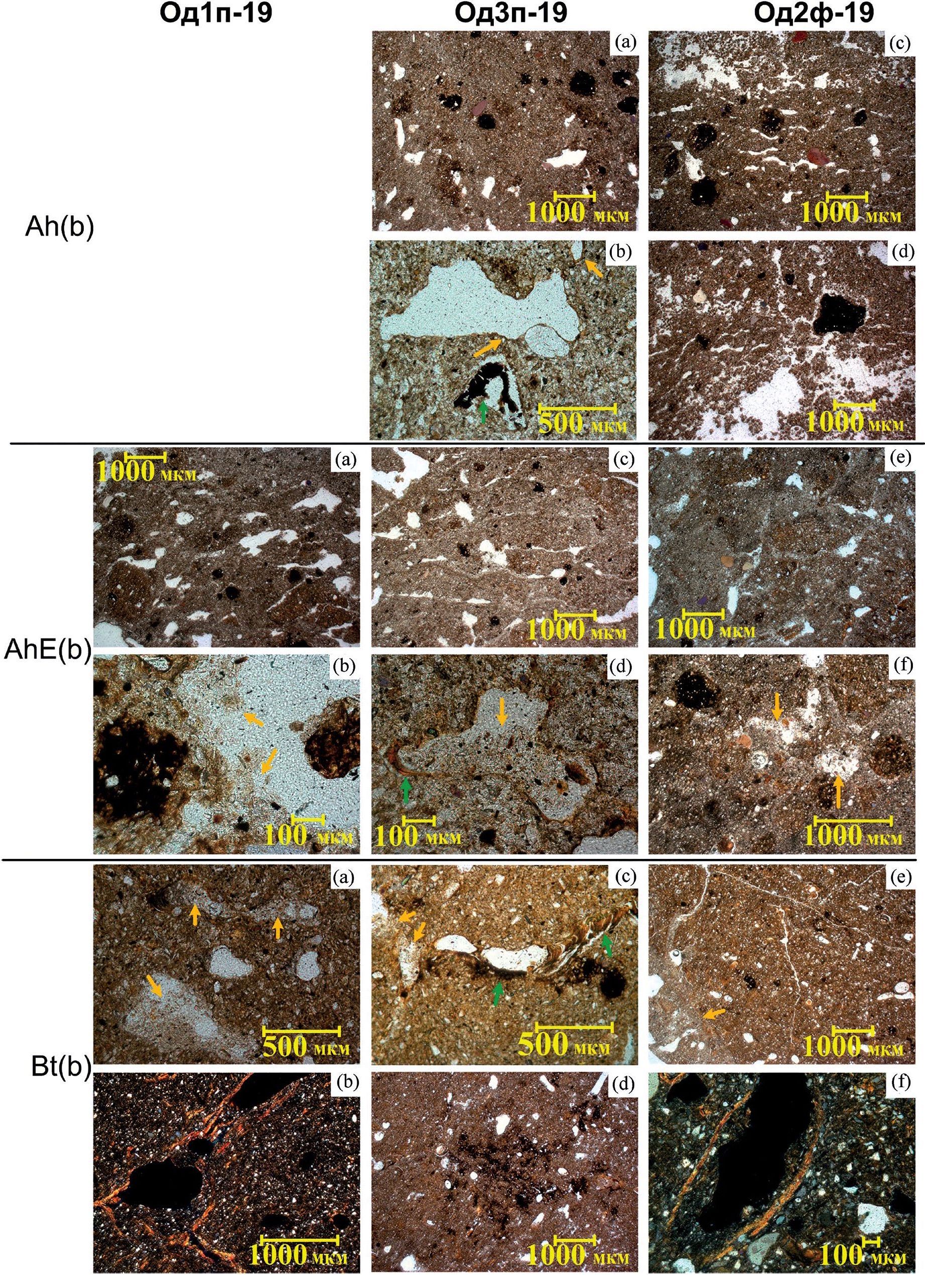 В горизонте AhE погребенных почв отмечается сеть субпараллельных трещин, делящих почвенную массу на листовато-пластинчатые структурные отдельности (рис. 2 AhE(b), a-c). Такое деление наилучшим образом выражено в разрезе Од3п-19 (рис. 2 AhE(b), c), тогда как в современной почве (разрез Од2ф-19) оно практически не обнаруживается (рис. 2 AhE(b), e). Органическое вещество в этом горизонте представлено в виде черных точек, причем концентрация этих точек в разрезе Од1п-19 заметно больше, чем в разрезе Од3п-19. В современной почве наряду с точечным гумусом, рассеянным в почвенной массе равномерно, имеются его скопления, а также почвенная масса сплошь прокрашена серым аморфным гумусом. Если в разрезах Од1п-19 и Од2ф-19 признаки активности мезофауны – выбросы в порах, иногда копрогенная структура, выражены ясно, то этого нельзя сказать о разрезе Од3п-19, где выбросы мезофауны строго обособлены и единичны. В рассматриваемом горизонте также хорошо заметны Fe–Mn стяжения, но их размеры уменьшаются, не превышают 50 мкм. В этом горизонте как погребенных, так и поверхностной почв четко выделяются осветленные микрозоны, а также лишенные покровов зерна первичных минералов (преобладает кварц) в порах (рис. 2, AhE(b), b, d, f оранжевые стрелки). Но лишь в разрезе Од3п-19 в тех же самых порах, а также совсем в мелких порах (несколько мкм) обнаруживаются тонкие Fe-глинистые пленки, иногда слоистые внутри (рис. 2, AhE(b), d, зеленая стрелка).