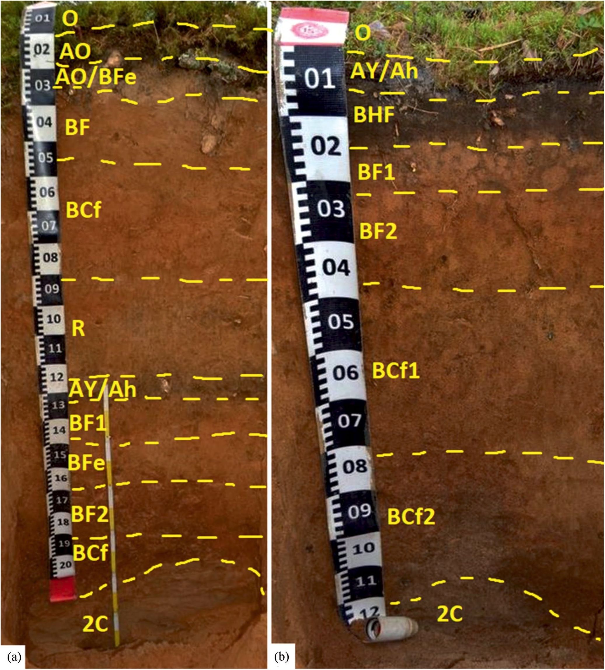 - – погребенная почва Ah(0–12 см)/BF(12–28 см)/BCf1(28–48 см)/BCf2(48–105 см)/2C(105–135 см);