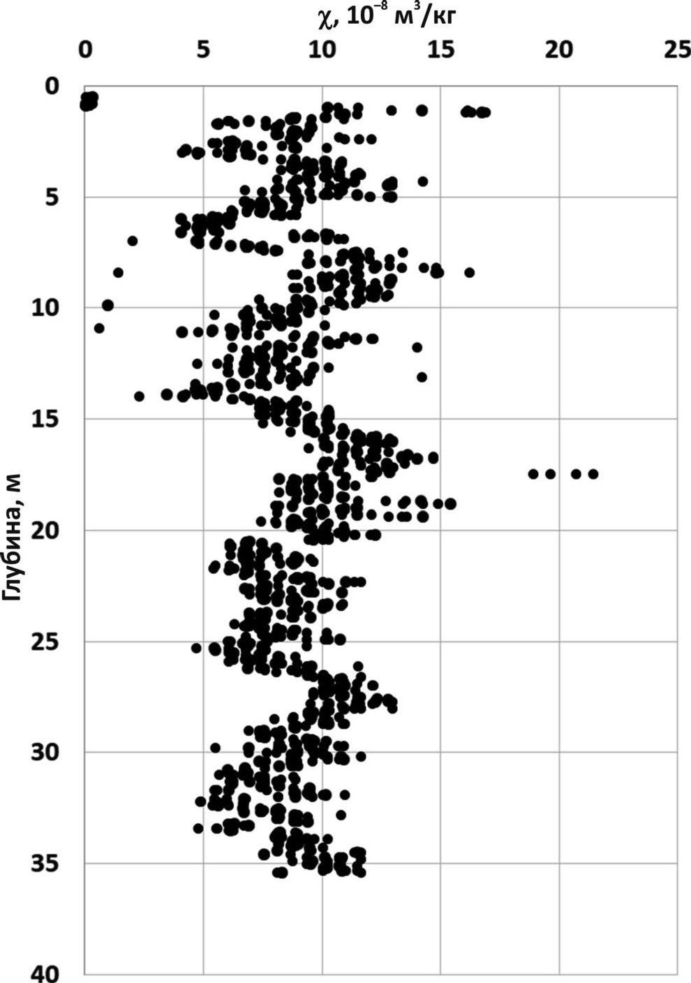 Магнитную восприимчивость материала почвенно-осадочной последовательности ледового комплекса измеряли в обнажении на мысу Малый Чукочий с помощью портативного прибора KT-5. Замеры производили сразу после оттаивания материала на толщину до 15–20 см, что превышает размер массива почвы, требуемого для измерения (10 см). Оттаивание материала перед измерением позволило избежать искажений разбавления за счет влияния на магнитную восприимчивость ледяных включений. В стенке обнажения высотой 35 м выполнено 1320 замеров на 330 глубинах, по 4 замера на каждой глубине.