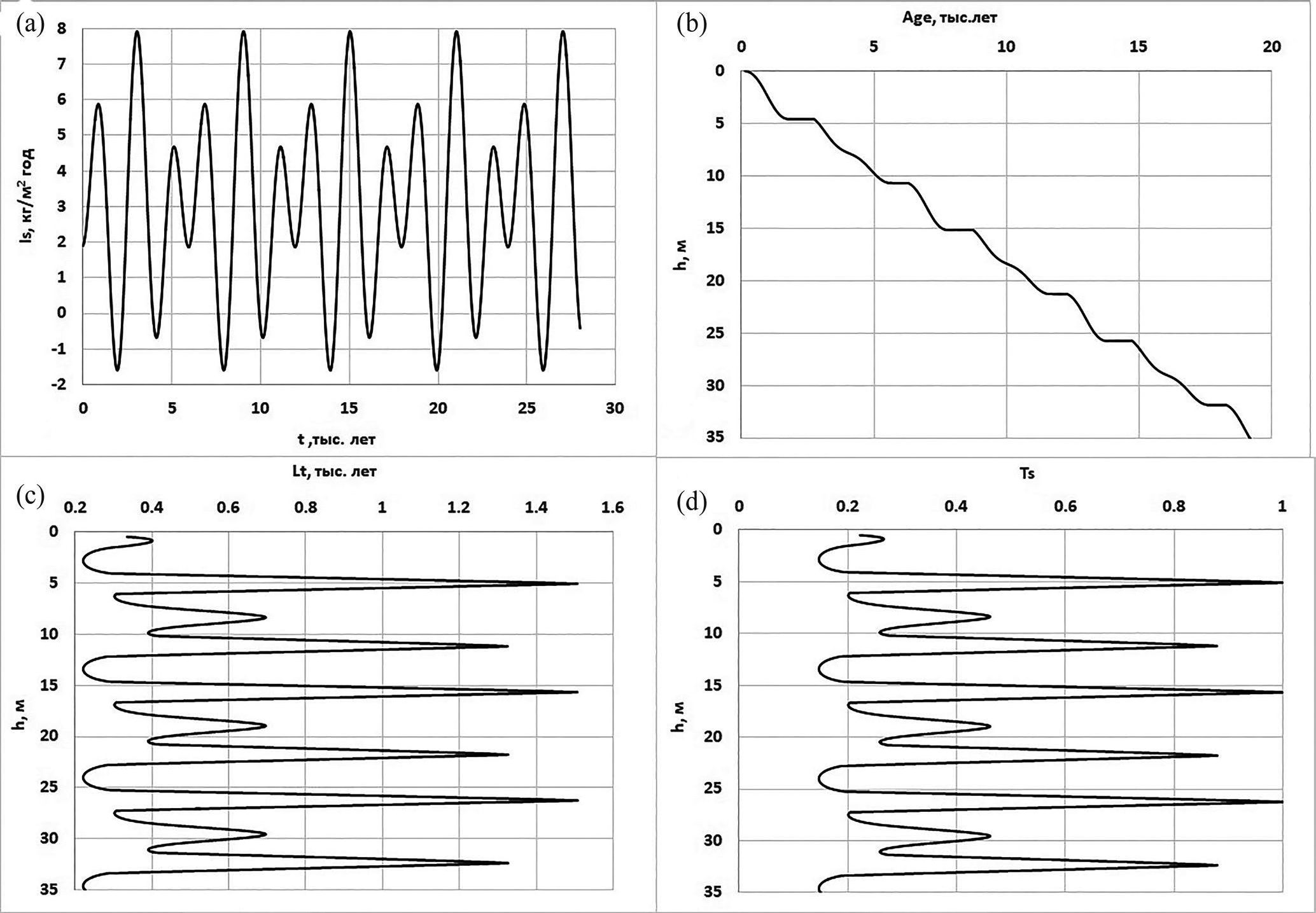 По этим коэффициентам рассчитана динамика интенсивности потока осадка, поступающего на поверхность (рис. 3a). Непостоянство интенсивности потока во времени приводит к ступенчатому распределению возраста осадка по глубине (рис. 3b). Кривые времени жизни осадка в сезонно-талом слое (рис. 3c) и степени трансформации (рис. 3d) одинаковы по форме, так как зависимость между этими показателями линейна.