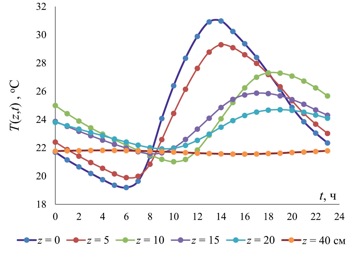 Значения температуры почвы T(ɀ, t) на глубине ɀ = 5, 10, 15, 20 и 40 см были рассчитаны по формулам (5), (6) и (22), (23). Для значений Ƙ использовали из табл. 4.