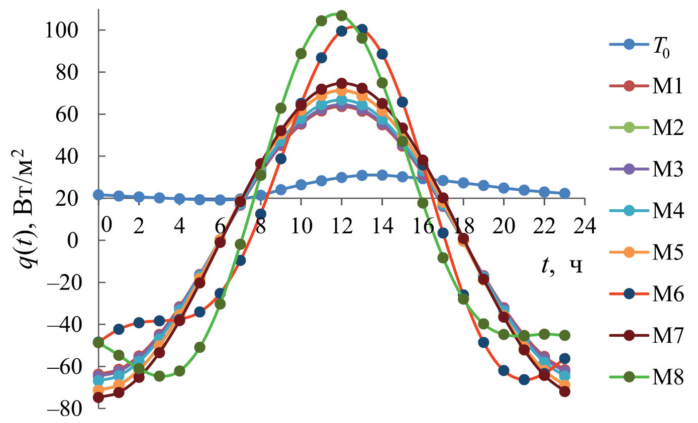 Используя данные табл. 2–4, а также формулы (24)–(30) и (36) определили тепловой поток q, на поверхности (ɀ = 0) почвы в момент времени t, рис. 2. Согласно точечной модели (М8), наибольший тепловой поток был определен в 12:00 дня (q = 106.85 Вт м⁻²), а наименьший – в 3:00 ночи (q = –64.62 Вт м⁻²) на поверхности почвы.