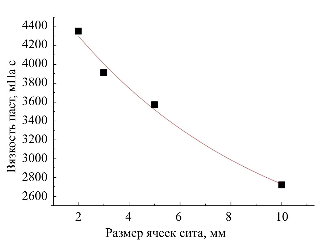 Рис. 2. Влияние активации продавливанием влажного чернозема через сита с разным размером ячеек на вязкость приготовленных из этих образцов паст.