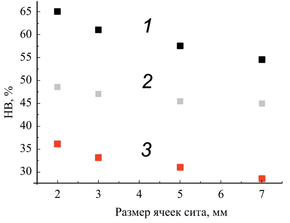 Рис. 3. Влияние механоактивации продавливанием влажных почв через сита с разным размером ячеек на НВ насыпных образцов почв: 1 – чернозем; 2 – серая лесная почва; 3 – дерново-подзолистая почва.