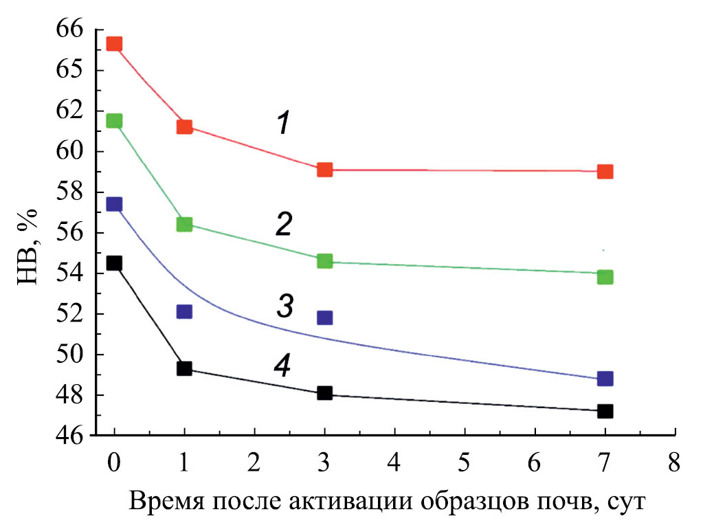 Рис. 4. Снижение во времени наименьшей влагоемкости образцов чернозема, активированных продавливанием через сита с размером ячеек: 2 (1), 3 (2), 5 (3) и 7 (4) мм.