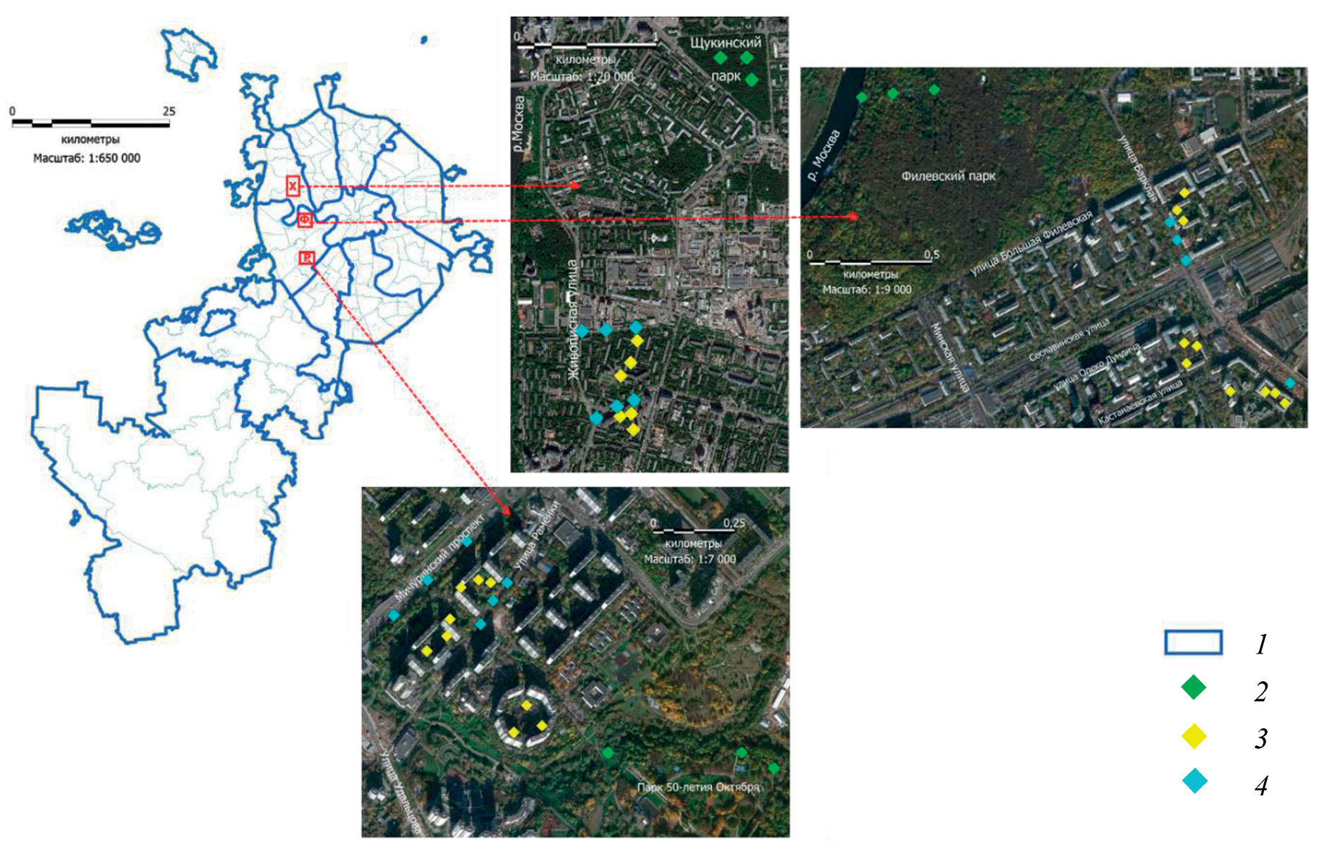 Участки Хорошево-Мневники и Филевcкий парк расположены на второй надпойменной террасе р. Москвы, сложенной аллювиальными разнозернистыми песками, супесями и суглинками, залегающими на донской морене, или перекрывающими ее аллювиально-флювиогляциальными отложениями. Участок Раменки находится на Теплостанской возвышенности, четвертичные отложения представлены валунными суглинками московской морены [16]. В почвенном покрове селитебных зон и участков, прилегающих к транспортным зонам, доминируют урбостратоземы и техноземы, созданные при благоустройстве территорий c нанесением поверхностного слоя согласно [20], в рекреационных зонах могут встречаться природные урбостратифицированные почвы: в Хорошево-Мневниках – ржавоземы, в Филевском парке – дерново-подзолистые и дерново-элювоземы типичные и оглеенные, в Раменках – дерново-подзолистые [57].