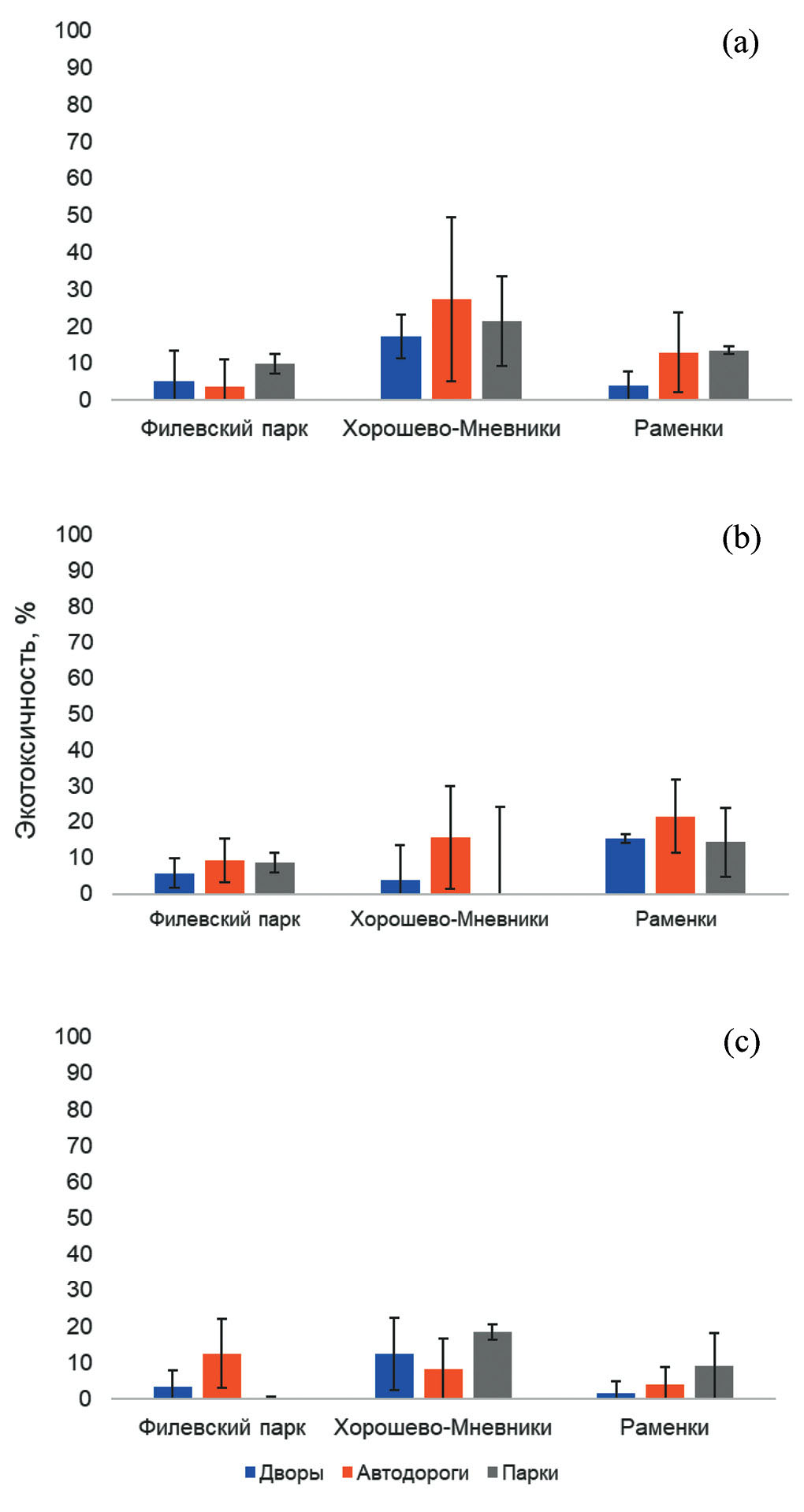 Так как достоверных корреляций экотоксичности пыли с изученными свойствами не обнаружено (табл. 1), можно предположить, что повышение экотоксичности пыли в районе Хорошево-Мневники может быть связано с более высоким содержанием в ней загрязняющих веществ.