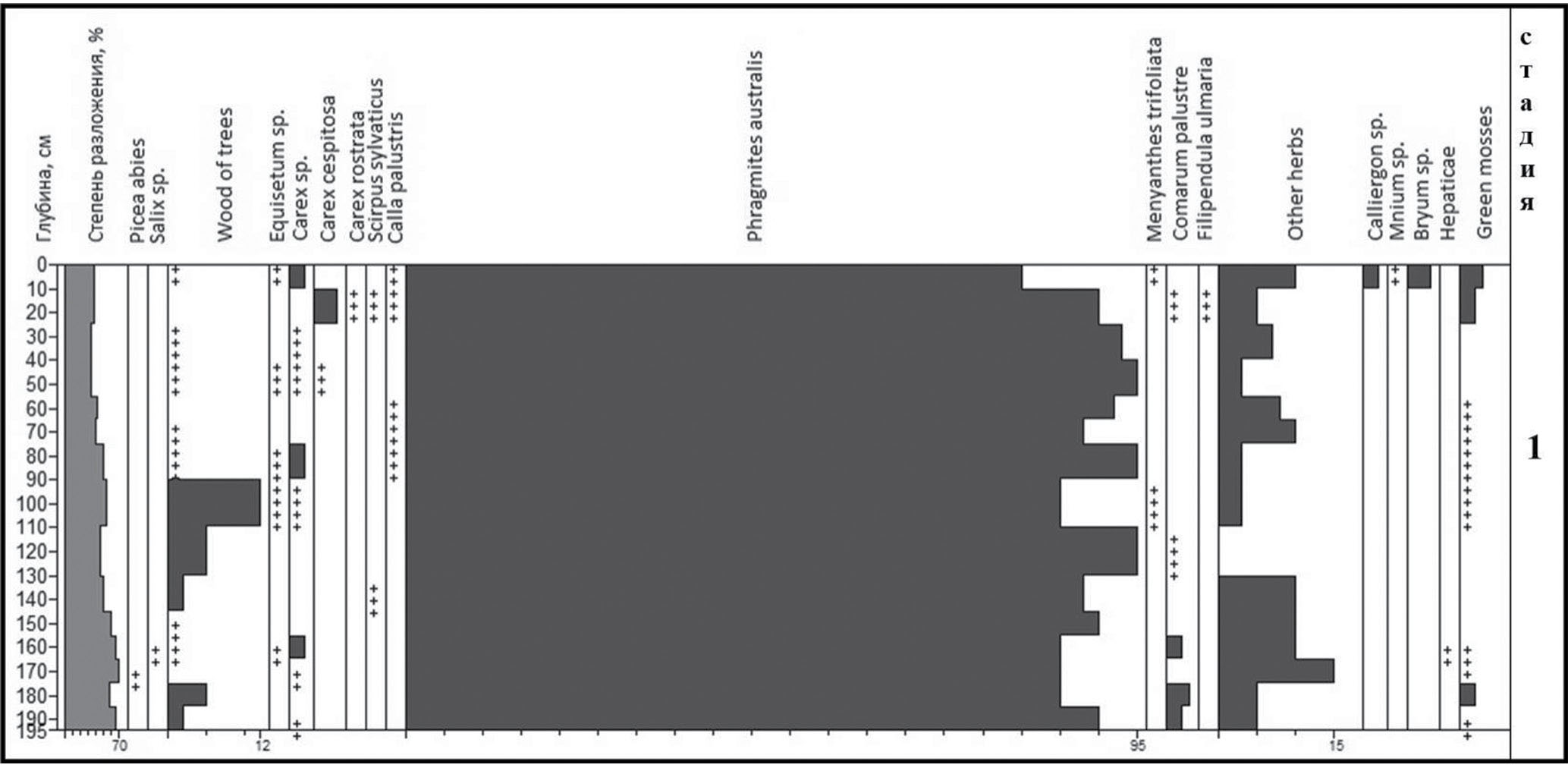 Рис. 1. Стратиграфическая диаграмма Большеберезовского болота (эвтрофный этап: 1 – тростниковая стадия).