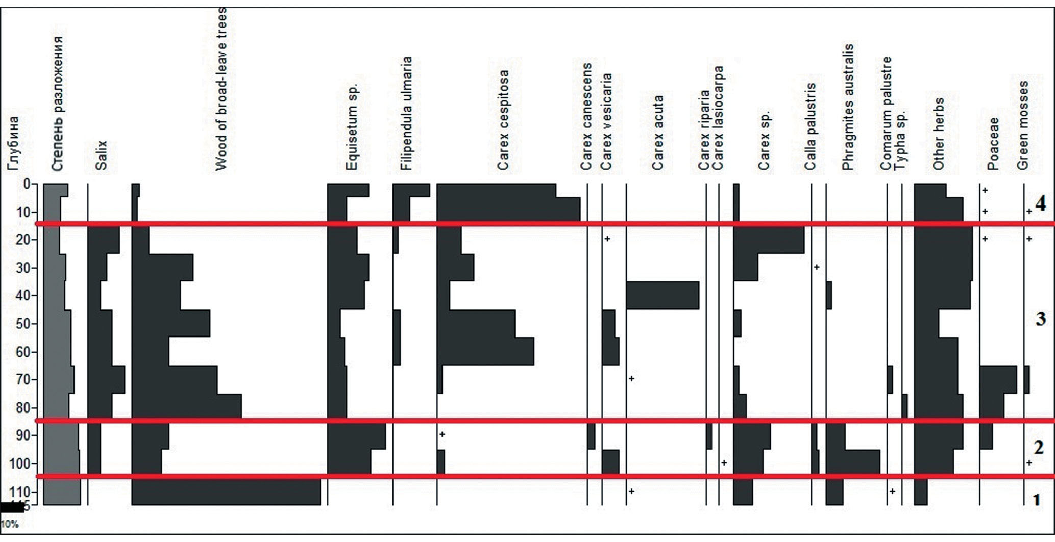 Рис. 2. Стратиграфическая диаграмма болота Подкосьмово (эвтрофный этап: 1 – древесная, 2 и 3 – древесно-травяная, 4 – осоковая стадии).