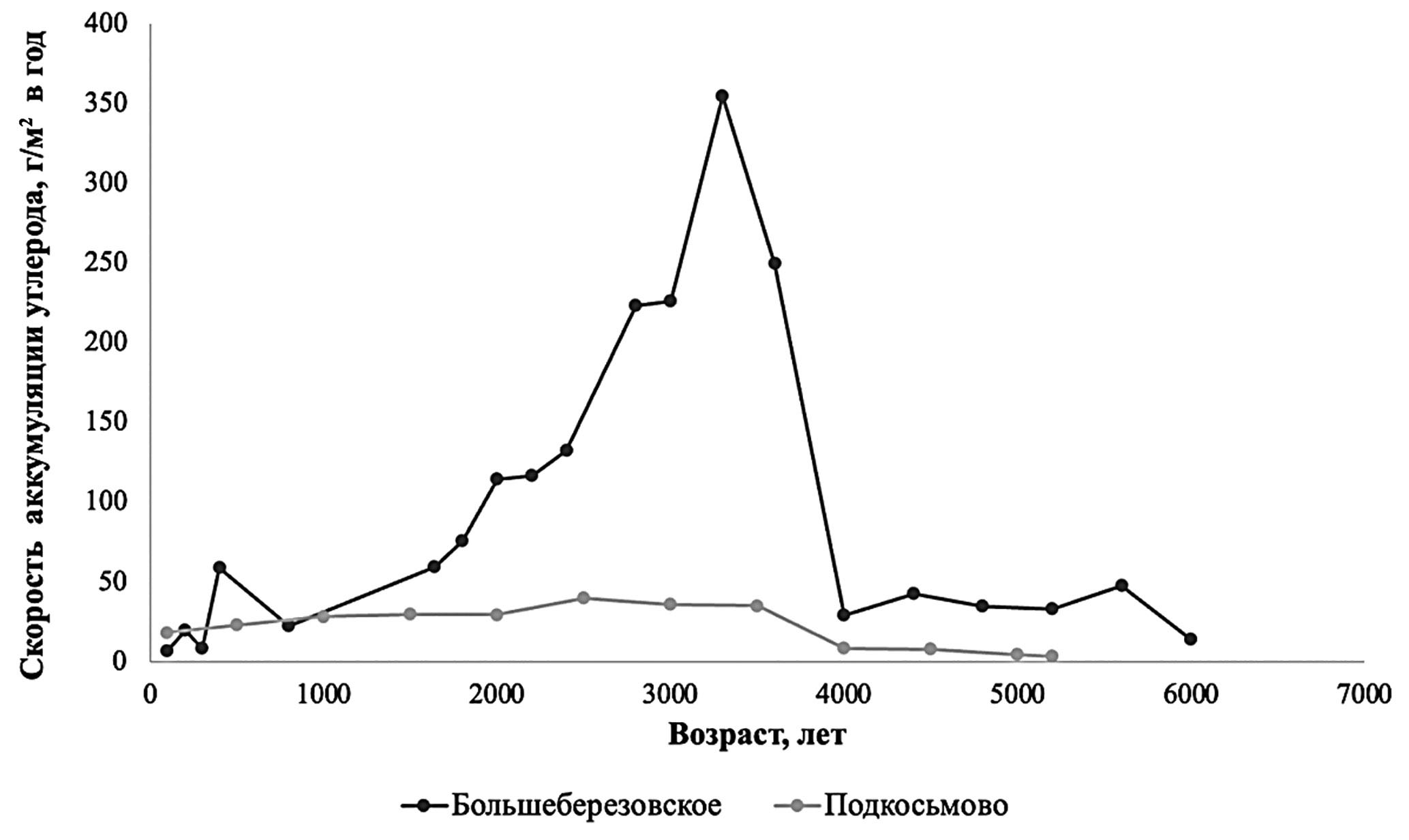 Образовавшееся в суббореальный период голоцена болото Подкосьмово не испытало антропогенного воздействия. Развитие болота началось с древесных палеоценозов, формирующихся при умеренном увлажнении и периодическом пересыхании понижения. Отмершие растительные остатки активно разлагались, и потому аккумуляция углерода такими палеоценозами протекала с низкой скоростью. Содержание и запасы углерода также минимальны в придонных горизонтах торфяной залежи. Увеличение интенсивности депонирования углерода отмечено в субатлантическом периоде (соответствует глубине 75–80 см). Повышение атмосферного увлажнения, наряду с грунтовым стоком (имеющим высокое содержание карбонатов), обеспечили, помимо древесных пород (ивы), разрастание влаголюбивых трав. Это ускорило аккумуляцию углерода (до 39.7 г/м2 в год), хотя и не так активно, как на Большеберезовском болоте. Показатели содержания углерода и его запасов в торфах, образованных в первой половине субатлантического периода, также максимальны. В торфах, образованных во второй половине субатлантического периода, показатели аккумуляции углерода снижаются, что обусловлено современным гидрологическим режимом болота, сочетающим высокое обводнение в весенний период и снижение УБВ (до –40 см) летом. Такие условия наиболее благоприятны для грибов и актиномицетов, активно участвующих в разложении растительных остатков. Кроме того, снижение содержания углерода в верхних горизонтах торфяной залежи связано с высокой зольностью образцов. Причиной этого является интенсивный эрозионный смыв с расположенных рядом сельскохозяйственных полей [26].