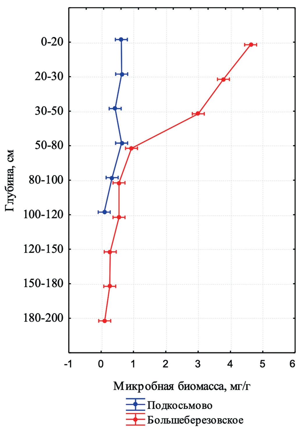 Микробная биомасса в профиле исследуемых болот варьировала от 0.1 до 4.6 мг/г (рис. 5). Большая часть профиля болота Подкосьмово характеризовалась слабыми колебаниями микробной биомассы (от 0.4 до 0.6 мг/г), однако, начиная с глубины 80 см и до подстилающей породы, фиксировали ее снижение (до 0.1 мг/г). В профиле болота Большеберезовское наблюдали уменьшение микробного титра вниз по профилю, которое носило более резкий характер в толще 0–80 см и плавный – на глубине 80–200 см.