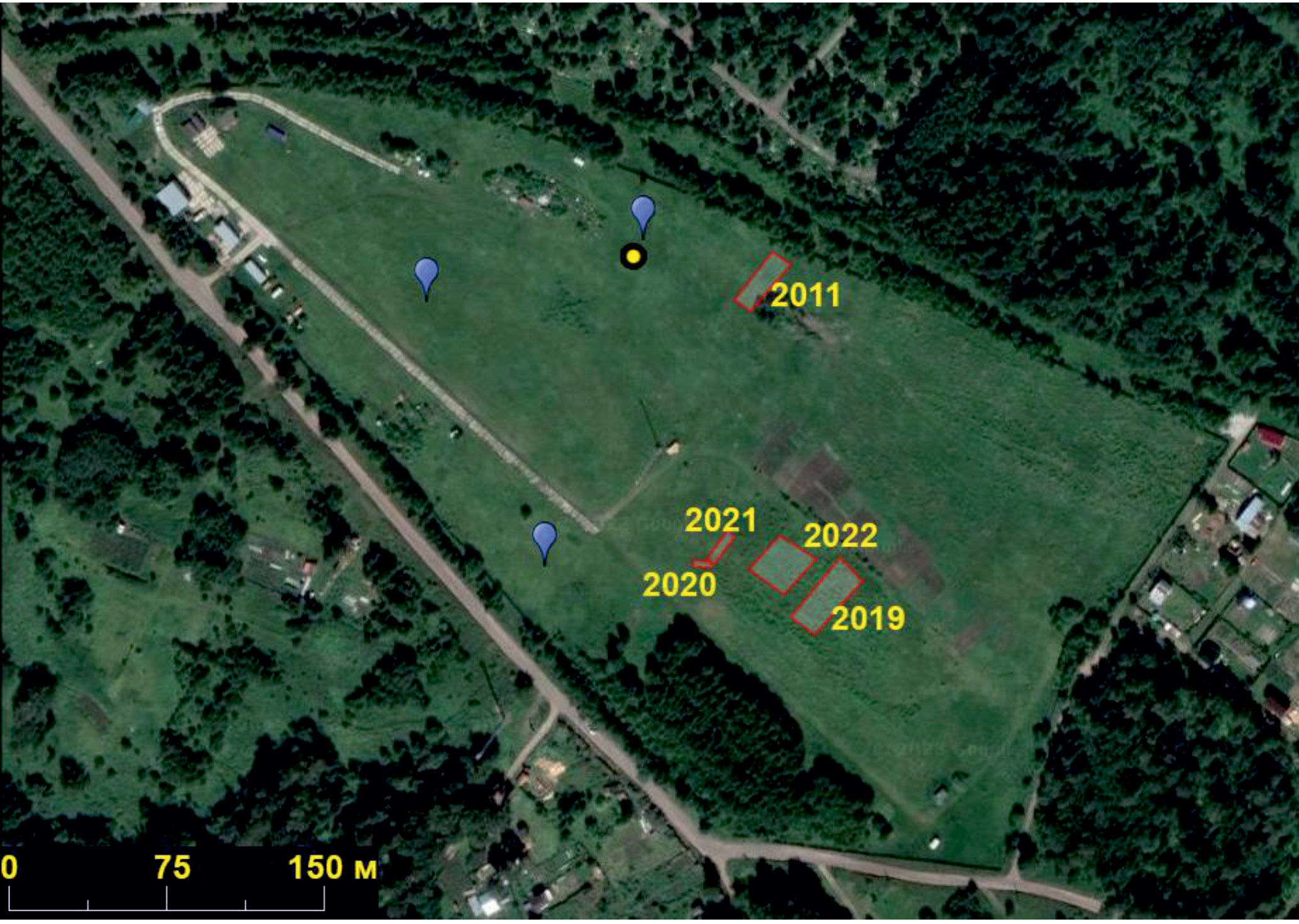 Границы площадок пожаров 2021 и 2022 гг. воспроизведены по сохранившимся кольям, отмечавшим углы. Расположение остальных площадок восстановлено по фотографиям с земли, сделанным в соответствующие годы, и с квадрокоптера (в 2022 г.) за счет привязки к сохранившимся на местности объектам (ямам, стогам, дорогам, строениям и т.п.) и описаниям линейных расстояний до них, а также использования исторических данных дистанционного зондирования Земли.