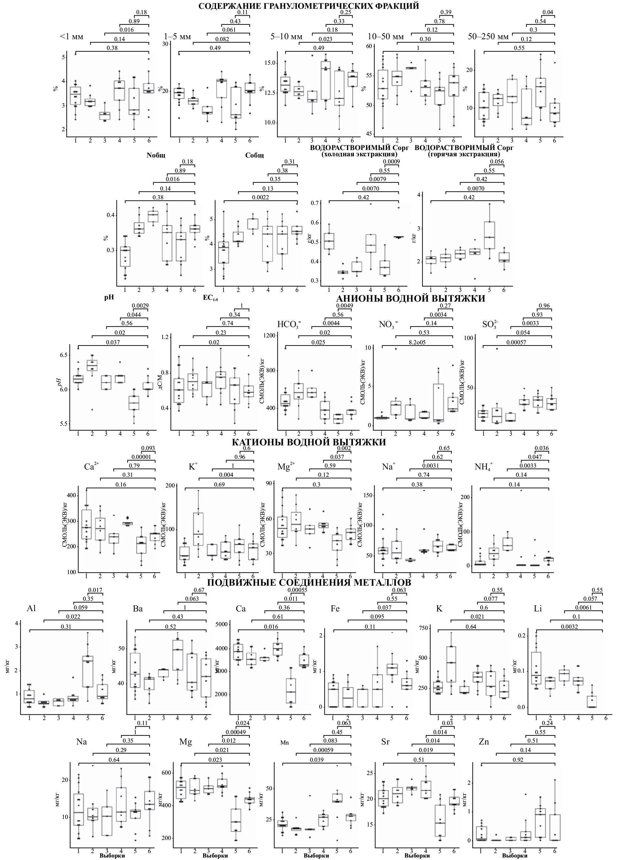 Во всех пробах определены следующие показатели. Величина рН измерена в водной суспензии при постоянном перемешивании (соотношение почва : раствор – 1 : 2.5) потенциометрически [16, 22] на приборе И-160МИ (Измерительная техника, Россия). Удельная электропроводность (ЕС1:5) определена кондуктометрически в водной вытяжке (1 : 5) [22] на приборе Hanna HI 98331 (Германия). Гранулометрический состав исследован лазерно-дифрактометрически [16] в образцах, растертых пестиком с резиновым наконечником и предварительно обработанных 4% Na4P2O7 для разрушения структурирующих агентов [16, 37], на приборе Analysette 22 Nano Tech (Fritsch, Германия) с применением ультразвуковой диспергации в соответствии с рекомендациями производителя и современными представлениями [25]. Катионно-анионный состав (содержание NO3–, NO2–, SO42–, Ca2+, K+, Mg2+, Na+ и NH4+) водной вытяжки (1 : 5) изучен хроматографически [16] на приборе Стайер (Аквилон, Россия). Общая щелочность (щелочность от HCO3–) определена титриметрически с 0.02 М H2SO4 и метиловым оранжевым [16, 22]. Общее содержание углерода (Собщ) и азота (Nобщ) получено методом каталитического сжигания в токе кислорода [16] на CHNS-O элементном анализаторе EA 1110 (CE Instruments, Италия). Водорастворимое органическое вещество экстрагировали из почв холодной и горячей водой по методике, подробно описанной в [4]. Содержание подвижных форм соединений металлов, извлеченных ацетатно-аммонийным буфером с рН 7.0, измерено методом атомно-эмиссионной спектрометрии с индуктивно-связанной плазмой на приборе iCAP-6500 (Thermo Scientific, США).