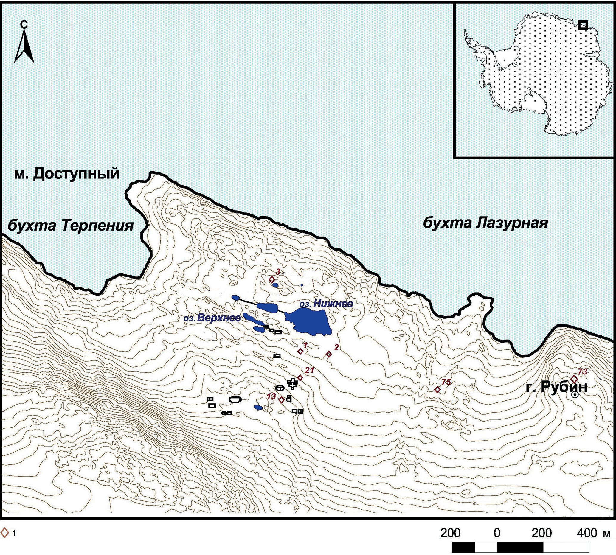 Регион исследования, пробы. Исследования выполнены в оазисе Вечерний, расположенном в восточной части Холмов Тала, Земля Эндерби. Оазис включает основную скалистую гряду с доминирующей высотой – собственно г. Вечерней (272.0 м) и несколько более низких гряд, вытянутых практически параллельно берегу с ориентацией северо-запад – юго-восток. Северо-восточные склоны гряд крутые и короткие, местами обрывистые, юго-западные – пологие. Гряды разделены террасированными долинами, днища которых заняты ледниками и руслами временных водотоков.