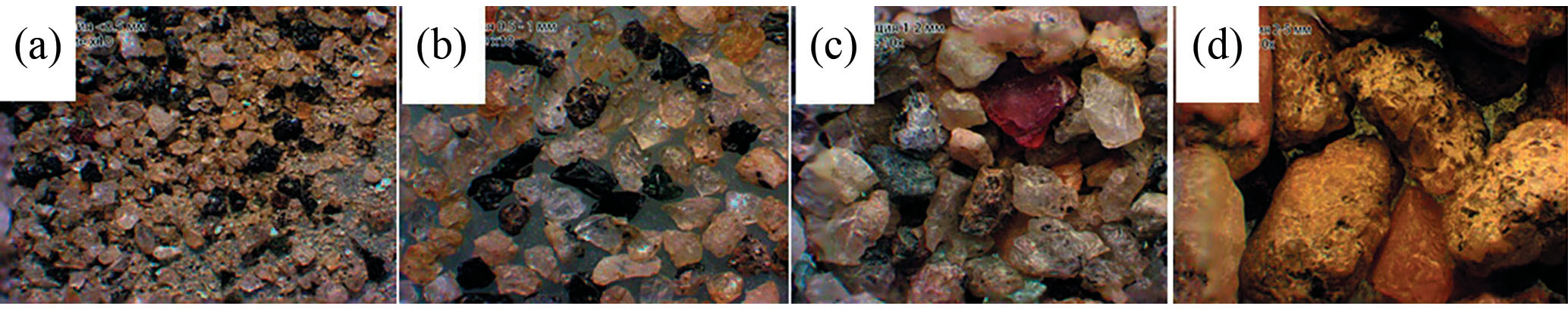Рис. 3. Примеры различных фракций почвы под микроскопом с 10-кратным увеличением (на примере пробы 1): а – <0.5 мм; b – 0.5–1 мм; c – 1–2 мм; d – 2–5 мм.