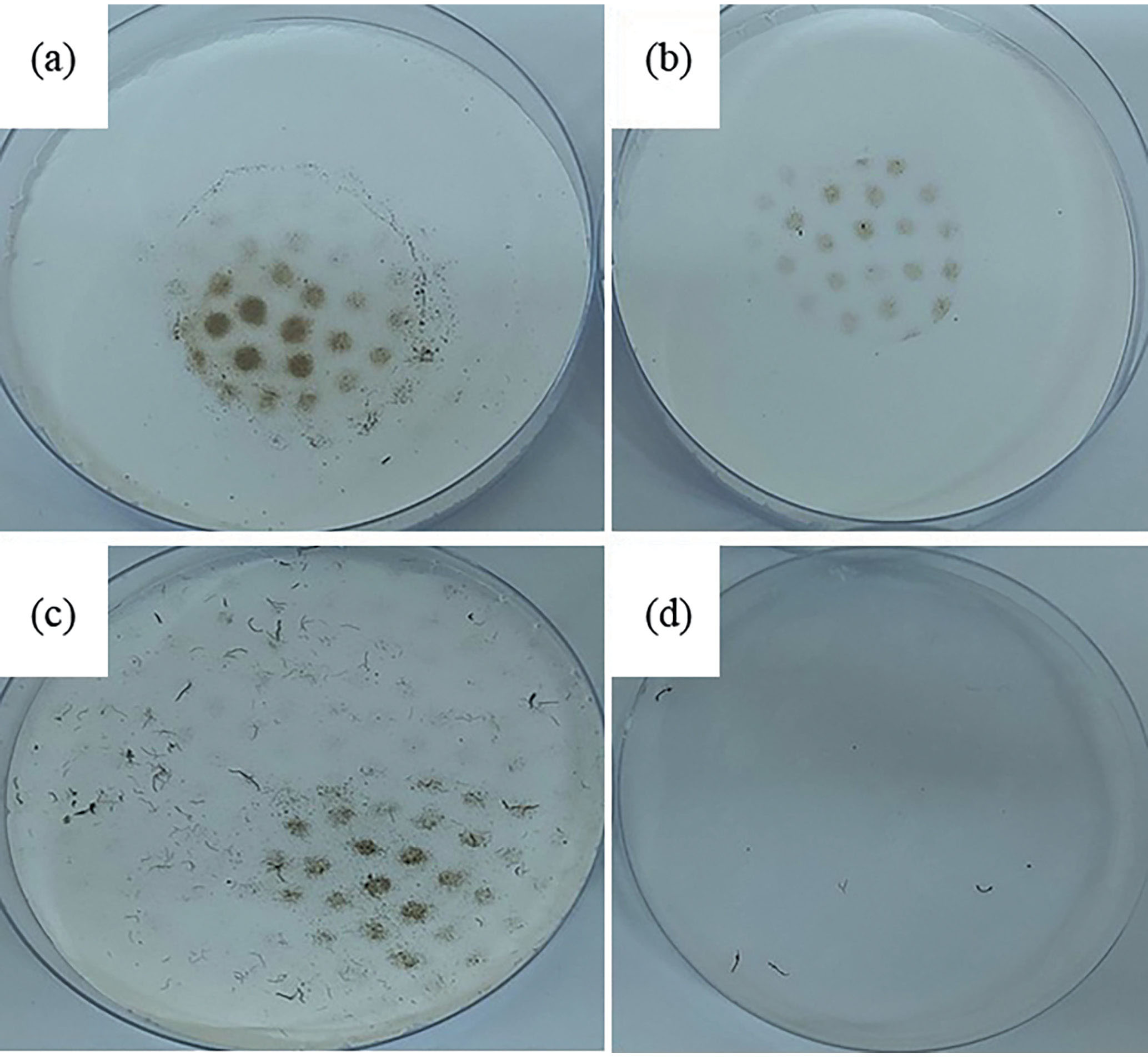 Рис. 4. Общий вид фильтров после фильтрации проб почв из солевого раствора и центрифугирования, фракции: a – <1 мм, b – 1–5 мм (проба 3); c – < 1 мм, d – 1–5 мм (проба 13).