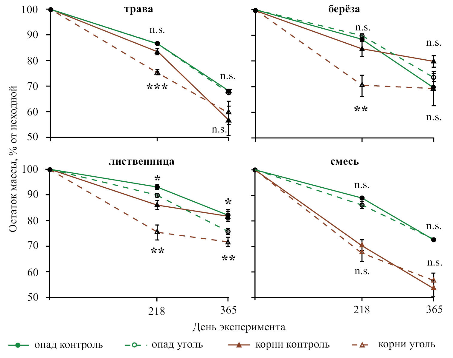 Проведенный эксперимент показал видоспецифические различия в разложении напочвенного и корневого опада. Большая часть потери массы древесных корней произошла в холодный период. При этом наблюдались схожие закономерности разложения для корней березы и лиственницы. Корни трав разлагались примерно одинаково с древесными в холодный период и ускорялись в теплый, что вероятно связано с большим содержанием лабильных компонентов в корнях травы. Предыдущее исследование показало ускорение разложения корней лиственницы в присутствии угля [12]. Настоящее исследование подтверждает видоспецифичность влияния угля на корни древесных видов (преимущественно лиственницы) и отсутствие эффекта для корней трав и смеси. В конце эксперимента потеря массы корней древесных видов (лиственницы и березы) в контрольном варианте не различалась, и была выше в присутствии угля. Химический состав опада древесных видов различается в большей степени, чем состав их корней, особенно по содержанию лигнина и фенолов [25, 41]. Это проявляется в различной потере массы хвои лиственницы и листьев березы и отсутствии различия между корнями этих древесных видов в контрольном варианте. В присутствии угля происходит сглаживание различий итоговой потери массы надземного опада между древесными видами за счет ускорения разложения хвои.