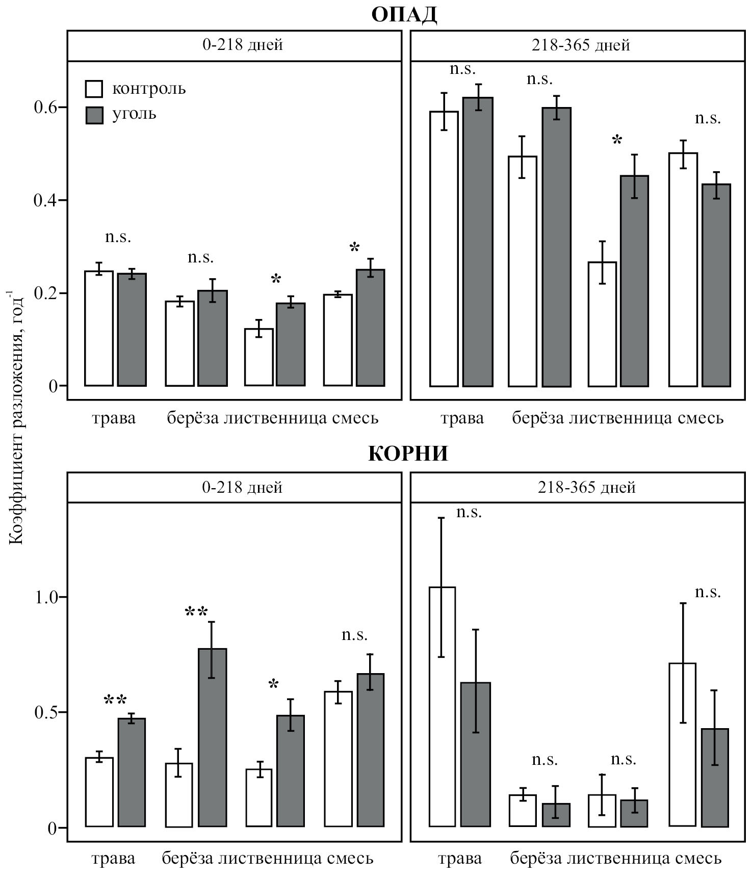 Рис. 4. Коэффициенты разложения опада и корней в начальный холодный (0–218 дней) и теплый (218–365 дней) периоды. Данные представлены средними величинами (n = 7), планки погрешностей отображают ±1SE. Значимое влияние угля в отдельных вариантах эксперимента обозначено (*) соответственно значениям p: *** <0.001, ** <0.01, * <0.05.