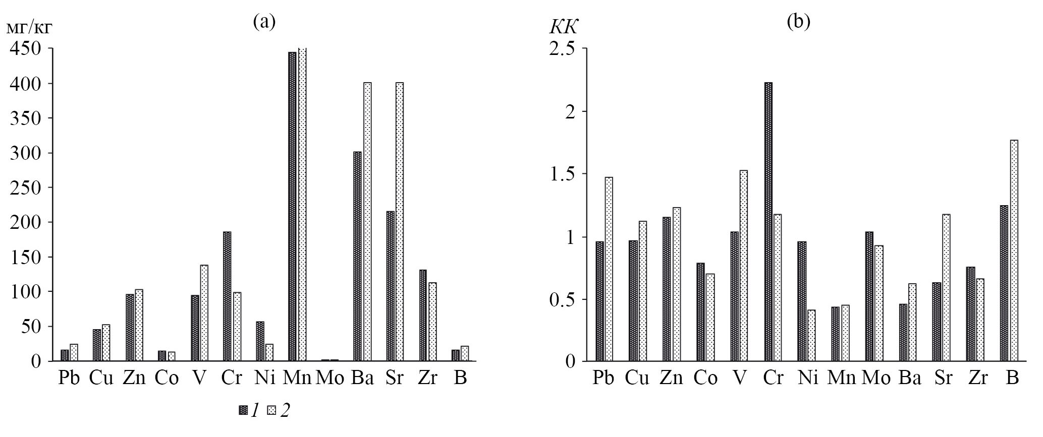 Рис. 1. Среднее содержание (а) и коэффициенты концентрации (b) микроэлементов в остаточных и переотложенных корах выветривания магматических (1) и карбонатных (2) почвообразующих породах в подтаежном и подтаежно-лесостепном лесорастительном поясе