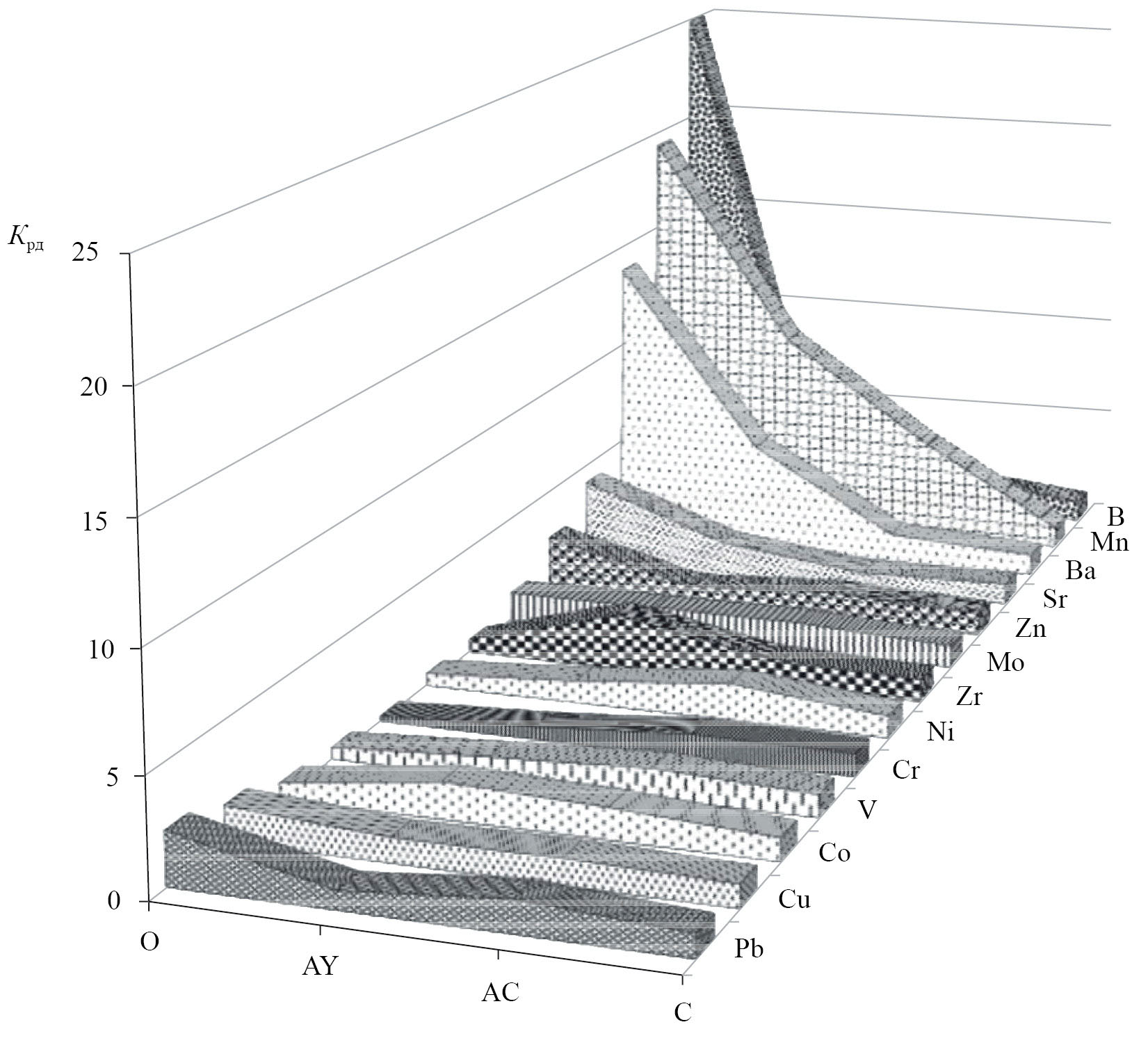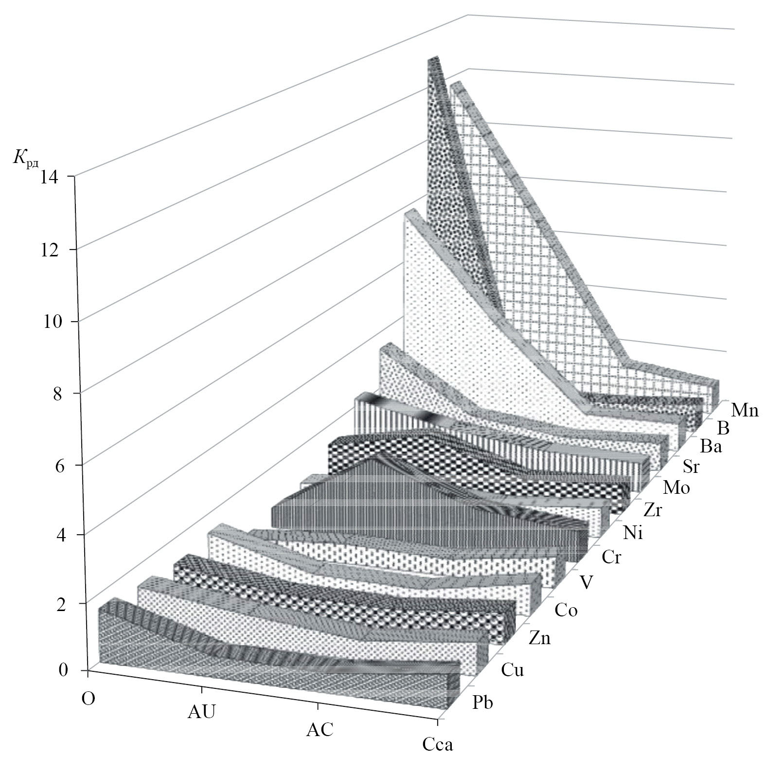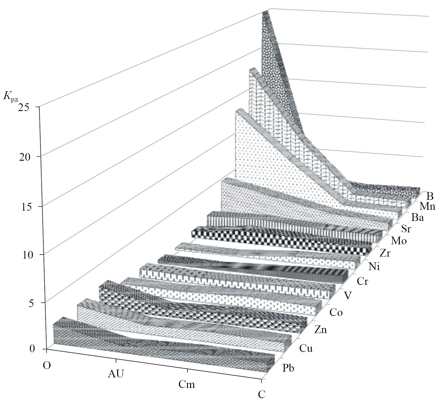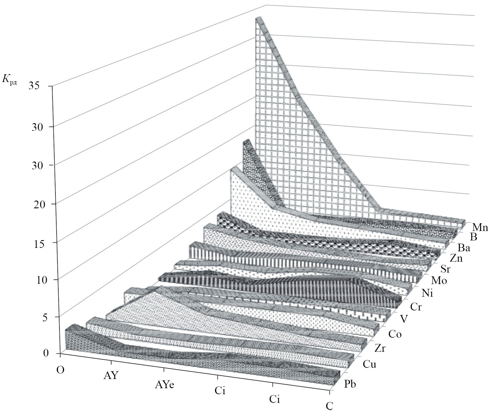 Приведенные коэффициенты радиальной дифференциации (Kрд) для профиля темногумусовых метаморфизованных почв свидетельствуют об их преимущественном аккумулятивном перераспределении по профилю, а также относительном накоплении некоторых микроэлементов в горизонте Cm (рис. 4). В органогенных горизонтах, по сравнению с почвообразующей породой, в большом количестве аккумулируется B, Mn и Ba.