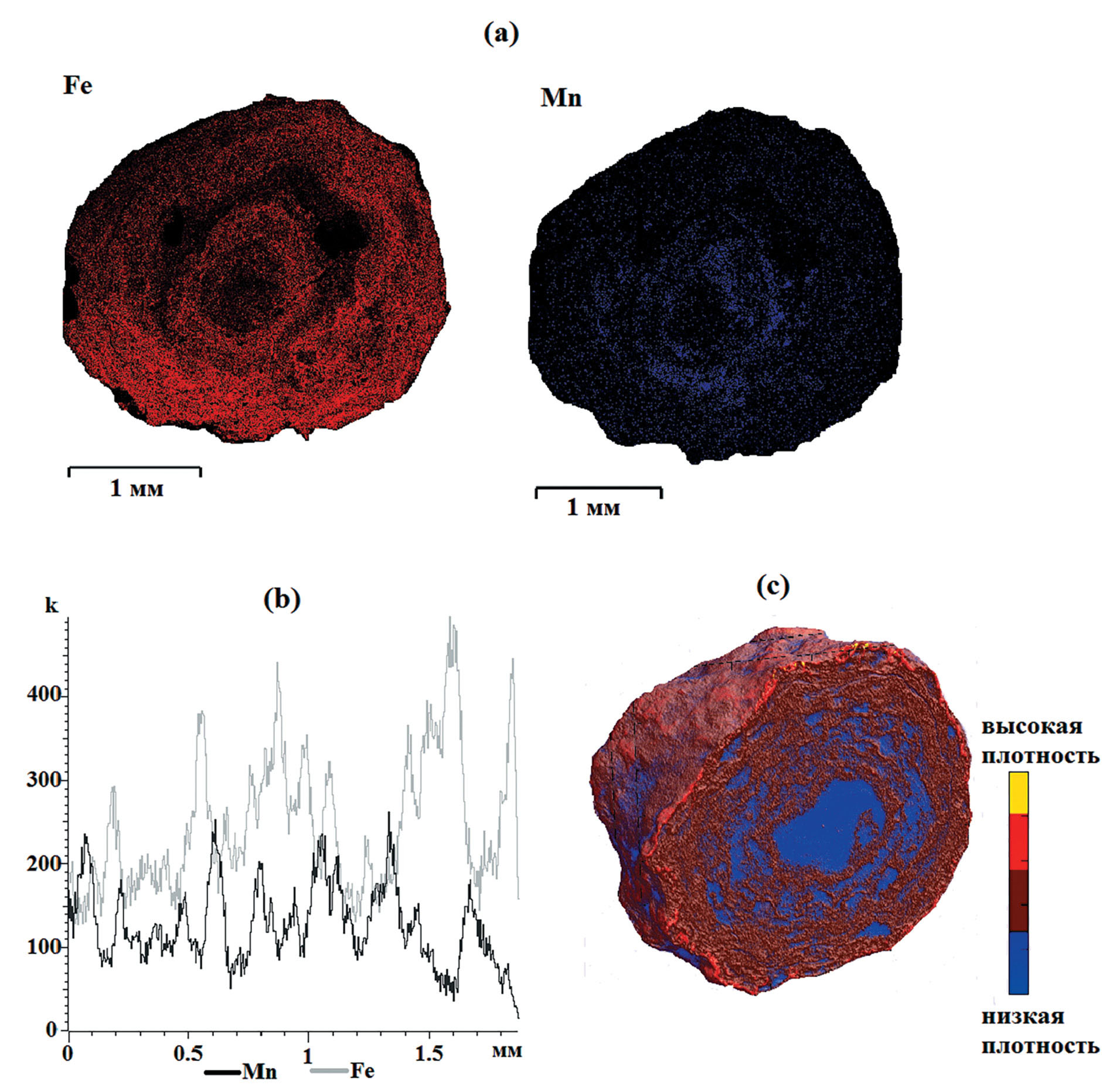 Рис. 2. Распределение основных ортштейнообразующих элементов и строение ортштейнов агротемногумусовых подбелов: а – карты распределения Fe и Mn в ортштейнах, b – изменение концентрации Fe и Mn при осаждении в ортштейнах, c – строение ортштейнов