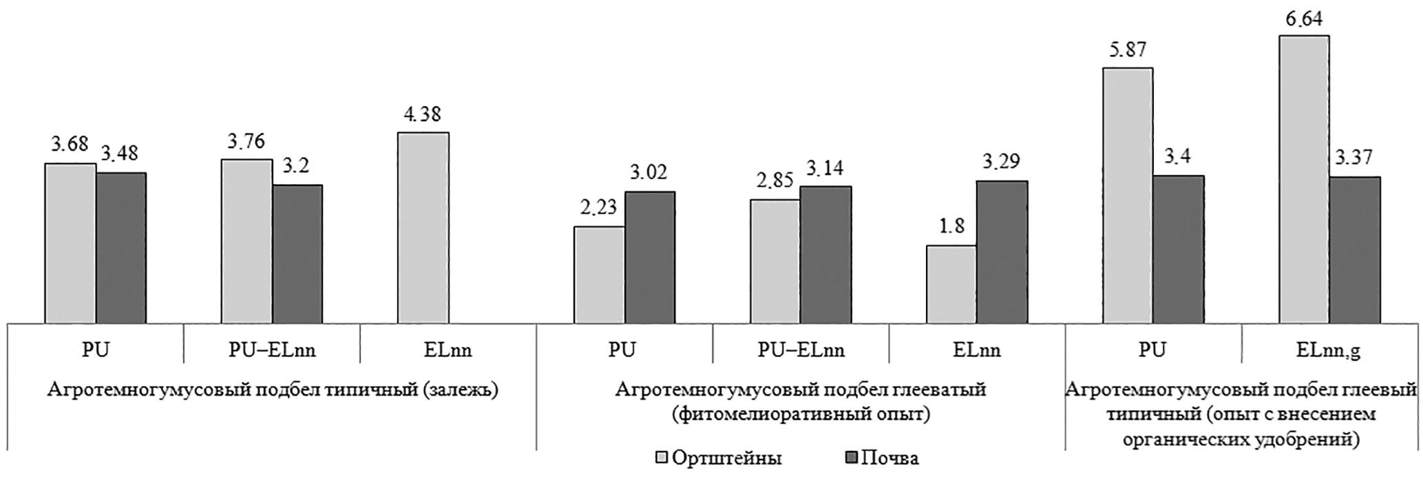 Коэффициент накопления (EF) элементов в ЖМО, показывающий во сколько раз интенсивность накопления элементов в ортштейнах опережает их накопление во вмещающей почвенной массе (без ортштейнов), рассчитывали согласно методике, рекомендованной в работе [29]: EF = Сорт/Спочв, где Сорт и Спочв содержание элемента в ортштейнах и почве (без ортштейнов).