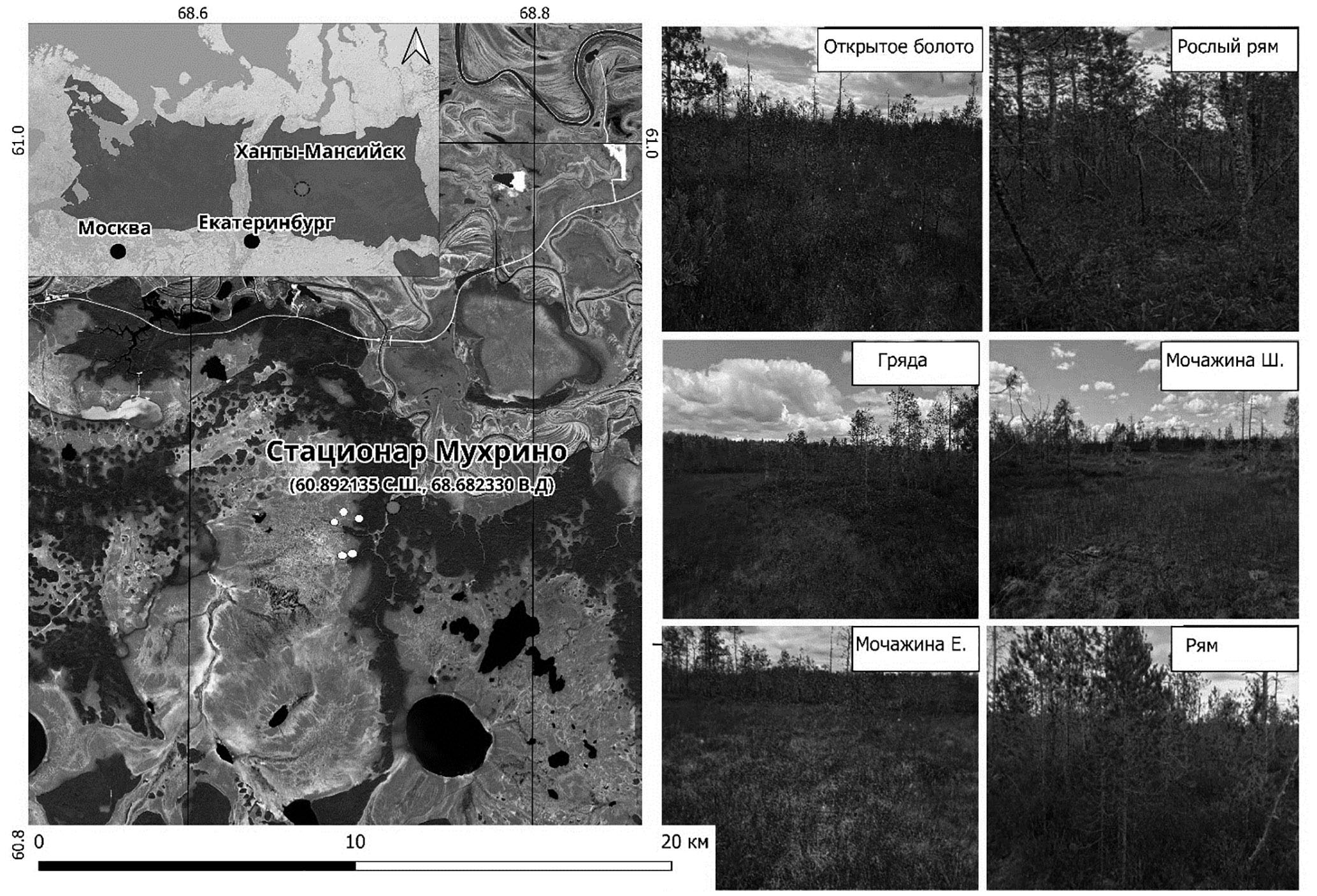 Выбор участков тестовых полигонов для оценки пространственно-временной изменчивости дыхания почвы осуществляли на основе комплекса имеющейся информации о свойствах болотных экосистем средней тайги Западной Сибири, а именно географической характеристики, климатических особенностей, преобладающего типа рельефа, почвообразующих пород и почвенного покрова, наиболее характерных типов болотных биотопов (для территории Ханты-Мансийского автономного округа), а также данных дистанционного зондирования, полевых рекогносцировочных маршрутов, транспортной доступности и имеющейся инфраструктуры (рис. 1).
