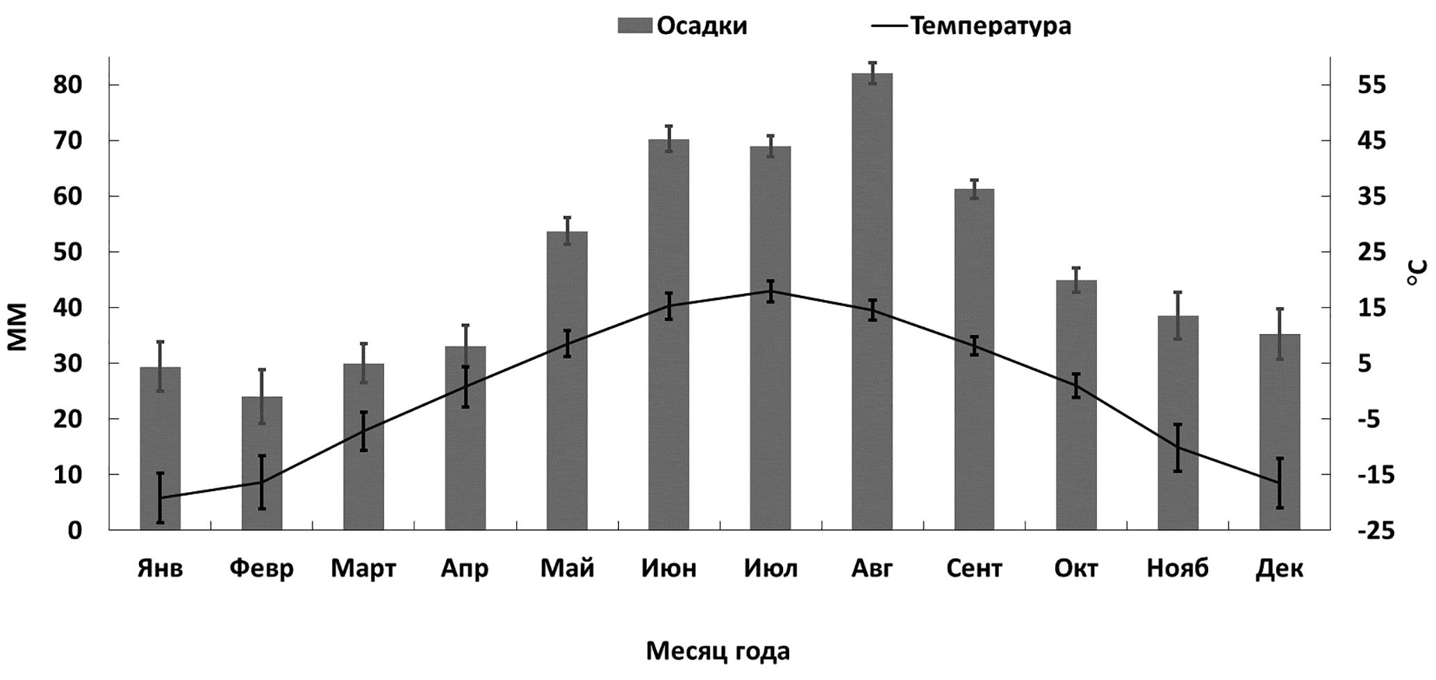 Рис. 2. Среднемноголетние осадки и температура воздуха, усредненные на основе данных метеостанций (г. Ханты-Мансийск, Ивдель и Угут) за период с 1991 по 2022 г.