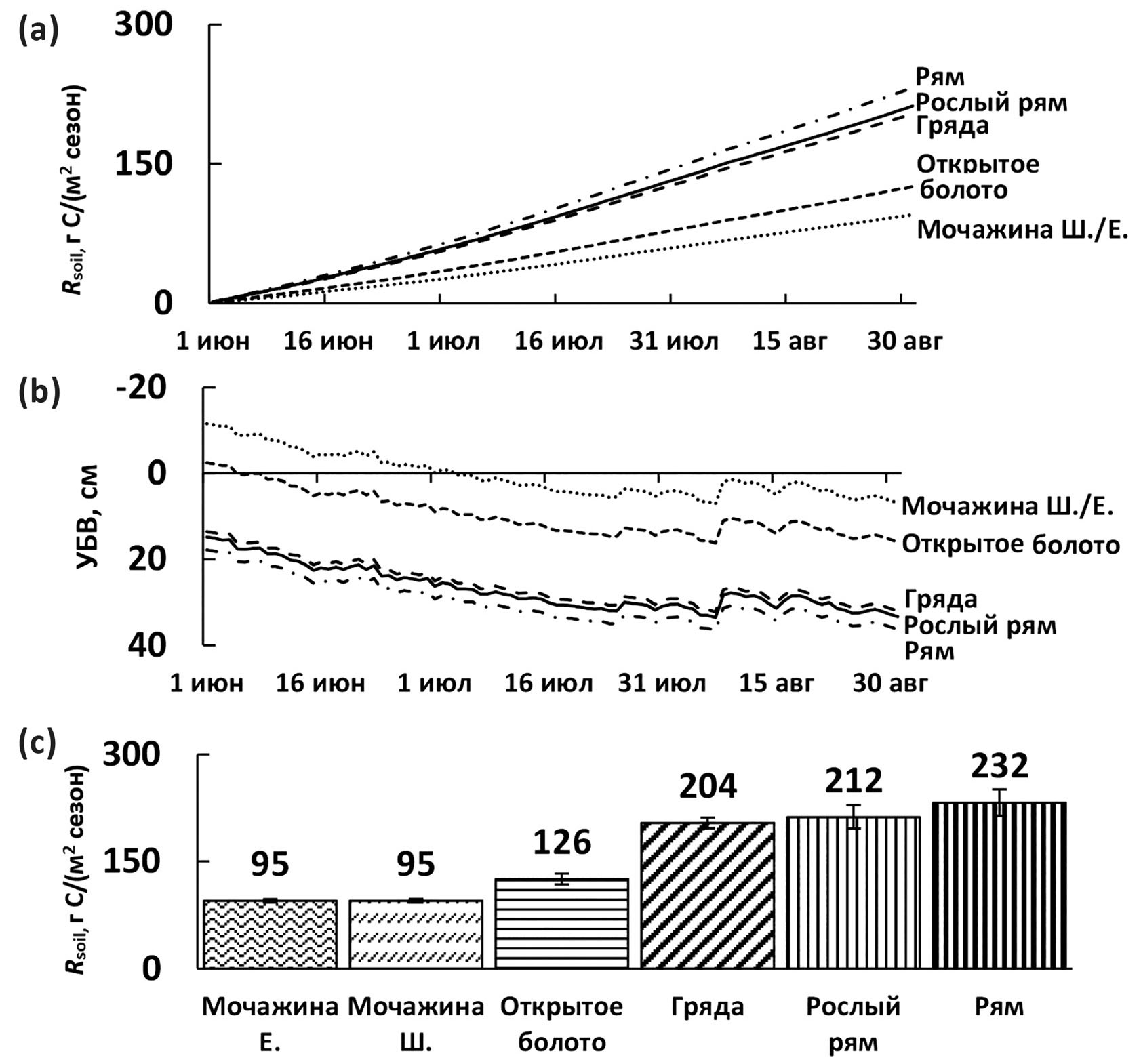 Результаты математического моделирования почвенного дыхания в течение сезона (с июня по август), основанного на зависимости Rsoil от УБВ, представлены на рис. 3. Наименьшее кумулятивное почвенное дыхание отмечено на наиболее увлажненных участках мочажина Ш и мочажина Е, наибольшее – на участках рям и рослый рям.