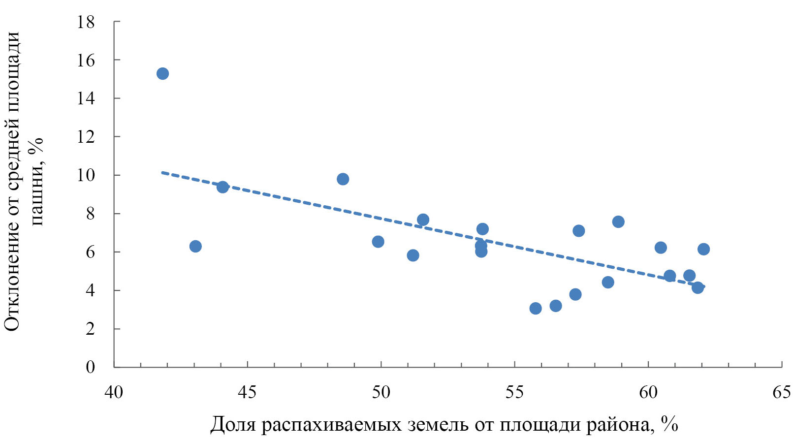 Рис. 2. График связи между отклонением от средней площади пашни и долей распахиваемых земель от площади районов Белгородской области