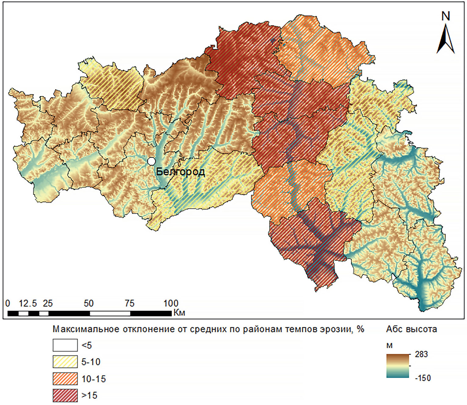 Максимальные отклонения от средних по районам объемов эрозионных потерь были рассчитаны по аналогии с другими оценками по формуле (1). Максимальные отклонения от средних объемов эрозионных потерь в целом по области составили 12.9%. В большинстве районов отклонения от средних объемов эрозионных потерь колеблются от 3 до 11%. Наиболее сильные отклонения от средних объемов эрозионных потерь были выявлены в Волоконовском (18.4%), Старооскольском (23.8%), Валуйском (25.1%), Губкинском (25.4%), Чернянском (25.7%) и Новооскольском (31.0%) районах. Таким образом, самые сильные отклонения от средних объемов эрозионных потерь и от средних темпов эрозии почвы выявлены в одних и тех же районах с самым сильным эрозионным расчленением (рис. 3).