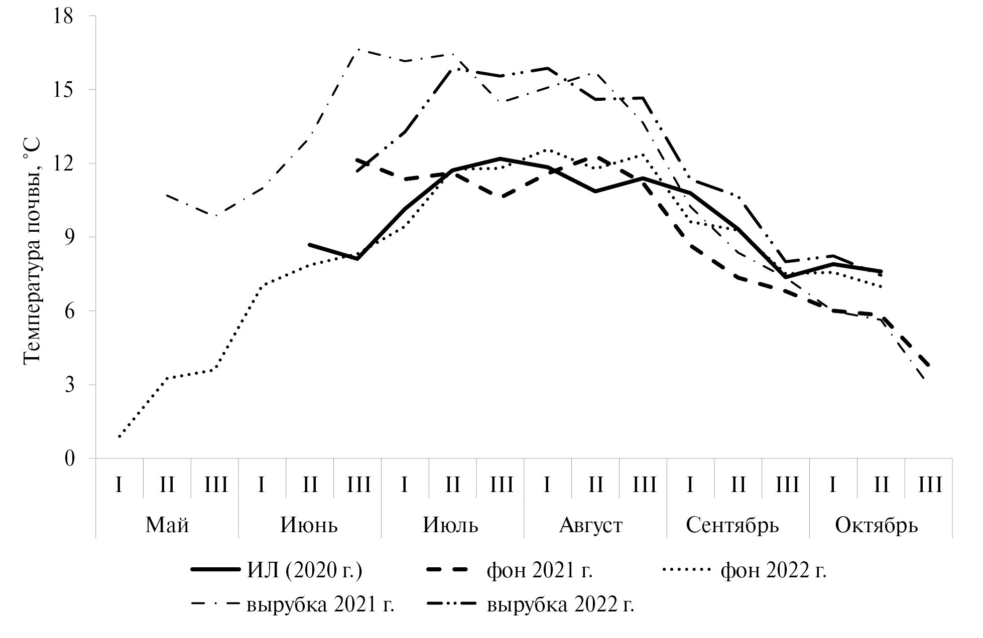 Эмиссию СО2 измеряли раз в месяц инфракрасным газоанализатором LI COR 8100 (LI-COR Inc., США) с почвенной камерой диаметром 20 см на стационарных основаниях высотой 10 см, которые были врезаны в лесную подстилку (до подгоризонта О(Н)) на 5 см за неделю до начала измерений. Изоляция и плотное прилегание камеры к основанию обеспечивается уплотнителем, расположенным на нижней части камеры. До рубки измерения проводили на 7 основаниях (всего более 250 определений потока СО2; около 50 измерений в месяц), после рубки в фоновом хвойно-лиственном насаждении и пасечных участках было установлено 5 и 6 оснований соответственно, на которых было выполнено по 160 и 230 измерений SR (15–25 определений потока СО2 в месяц). Надземные зеленые части растений напочвенного покрова срезали. Перед рубкой основания убирали. Во время определения скорости эмиссии СО2 измеряли температуру на глубине 10 см и влажность почвы в слое 0–5 см датчиками, входящими в комплектацию прибора. Глубина 10 см для оценки влияния температуры почвы выбрана в связи с ее меньшими суточными амплитудами. Выбор слоя 0–5 см для характеристики воздействия влажности почвы на SR обусловлен тем, что в верхних слоях происходит более активное разложение растительного опада и лесной подстилки. Непрерывное измерение (8 измерений в сутки) температуры почвы осуществлялось метеостанциями фирмы НОВО (Onset, США). Результаты по динамике температуры почвы в течение бесснежного периода 2020 г. представлены на основании 118 среднесуточных данных, в 2021 – 130 и 170 в фоновом насаждении и вырубке, в 2022 – 172 и 118 среднесуточных значений соответственно.